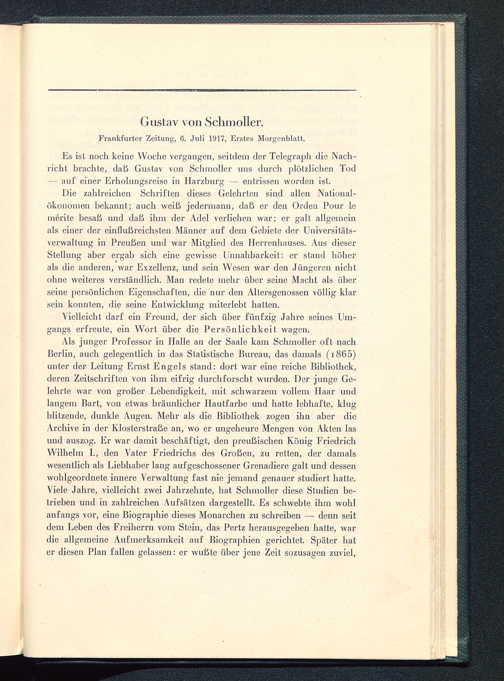 Es ist noch keine Woche vergangen, seitdem der Telegraph die Nach-richt brachte, daß Gustav von Schmoller uns durch plötzlichen Tod— auf einer Erholungsreise in llarzburg — entrissen worden ist.
