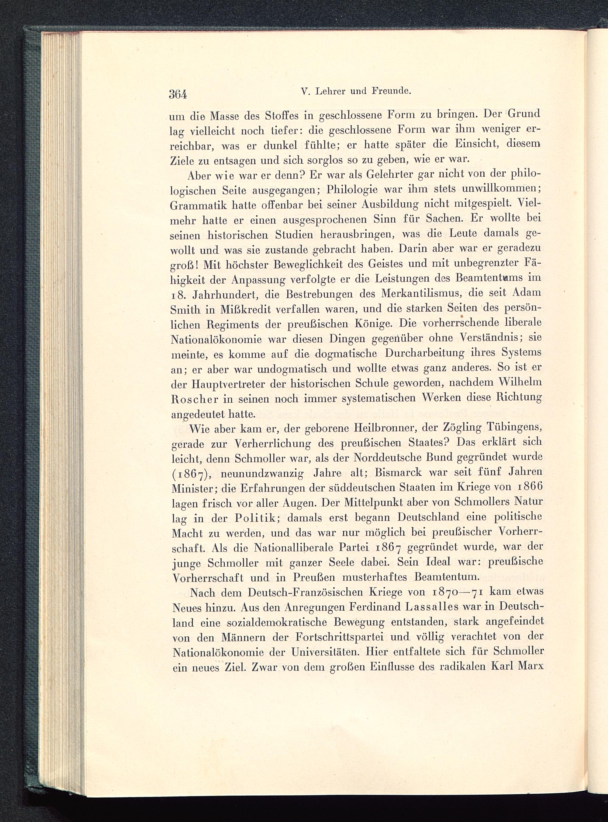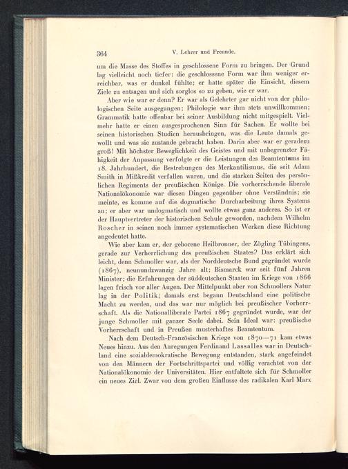 Nach dem Deutsch -Französischen Kriege von 1870—71 kam etwasNeues hinzu. Aus den Anregungen Ferdinand Lassalles war in Deutsch-land eine sozialdemokratische Bewegung entstanden, stark angefeindetvon den Männern der Fortschrittspartei und völlig verachtet von derNationalökonomie der Universitäten. Hier entfaltete sich für Schmollerein neues Ziel. Zwar von dem großen Einllusse des radikalen Karl Marx