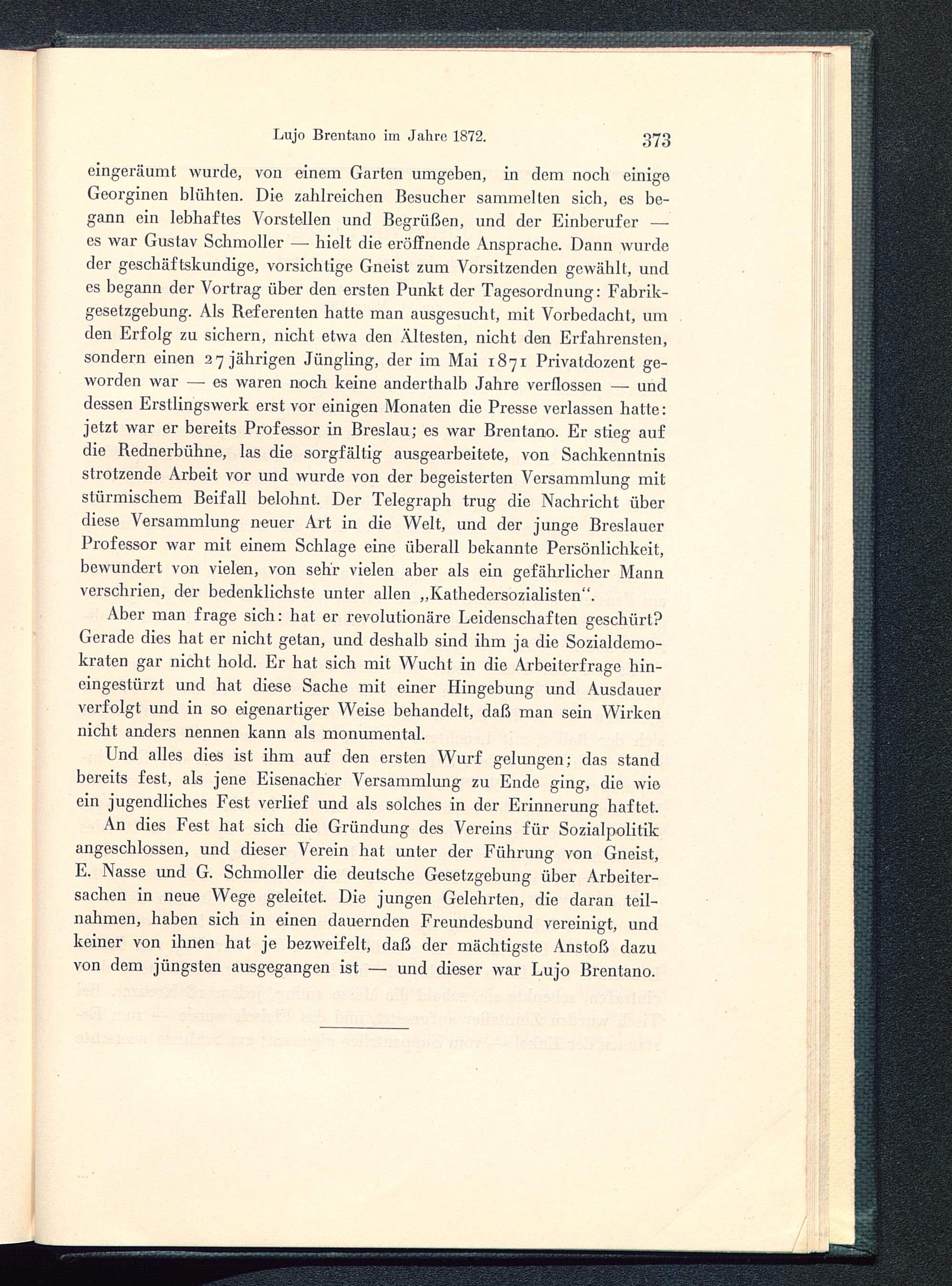 An dies Fest hat sich die Gründung des Vereins für Sozialpolitikangeschlossen, und dieser Verein hat unter der Führung von Gneist,E. Nasse und G. Schmoller die deutsche Gesetzgebung über Arbeiter-sachen in neue Wege geleitet. Die jungen Gelehrten, die daran teil-nahmen, haben sich in einen dauernden Freundesbund vereinigt, undkeiner von ihnen hat je bezweifelt, daß der mächtigste Anstoß dazuvon dem jüngsten ausgegangen ist — und dieser war Lujo Brentano .