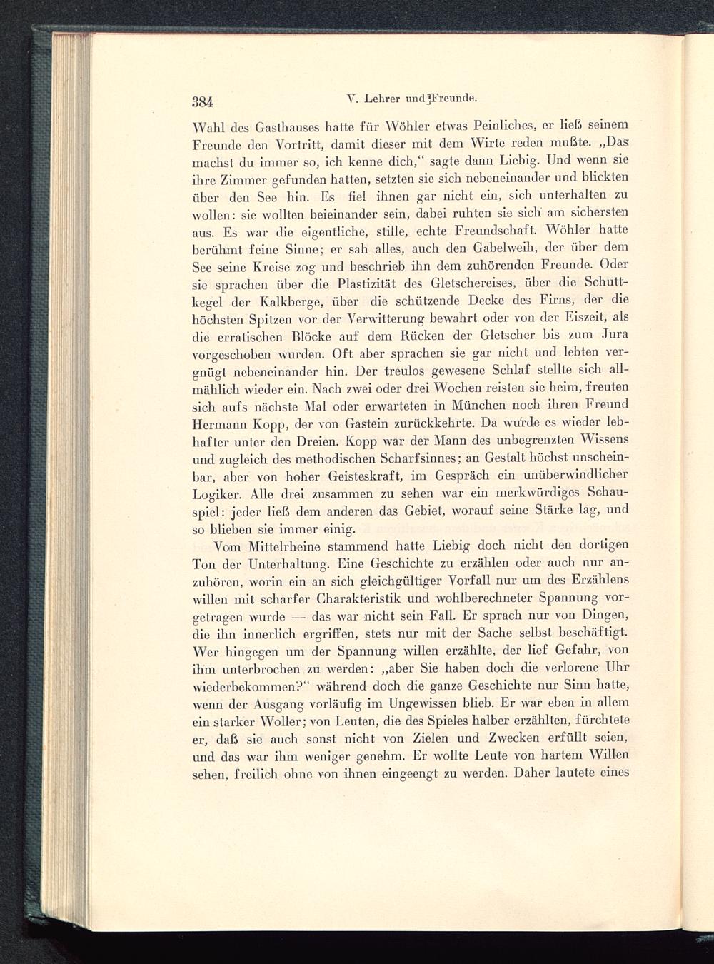 Wahl des Gasthauses halte für Wühler etwas Peinliches, er ließ seinemFreunde den Vortritt, damit dieser mit dem Wirte reden mußte. „Dasmachst du immer so, ich kenne dich,“ sagte dann Liebig. Und wenn sieihre Zimmer gefunden halten, setzten sic sich nebeneinander und blicktenüber den See hin. Es fiel ihnen gar nicht ein, sich unterhalten zuwollen: sie wollten beieinander sein, dabei ruhten sie sich am sicherstenaus. Es war die eigentliche, stille, echte Freundschaft. Wühler hatteberühmt feine Sinne; er sah alles, auch den Gabelweih, der über demSee seine Kreise zog und beschrieb ihn dem zuhürenden Freunde. Odersie sprachen über die Plastizität des Gletschereises, über die Schutt-kegel der Kalkberge, über die schützende Decke des Firns, der diehüchslen Spitzen vor der Verwitterung bewahrt oder von der Eiszeit, alsdie erratischen Blücke auf dem Rücken der Gletscher bis zum Juravorgeschoben wurden. Oft aber sprachen sie gar nicht und lebten ver-gnügt nebeneinander hin. Der treulos gewesene Schlaf stellte sich all-mählich wieder ein. Nach zwei oder drei Wochen reisten sie heim, freutensich aufs nächste Mal oder erwarteten in München noch ihren FreundHermann Kopp, der von Gastein zurückkehrte. Da wurde es wieder leb-hafter unter den Dreien. Kopp war der Mann des unbegrenzten Wissensund zugleich des methodischen Scharfsinnes; an Gestalt hüchst unschein-bar, aber von hoher Geisteskraft, im Gespräch ein unüberwindlicherLogiker. Alle drei zusammen zu sehen war ein merkwürdiges Schau-spiel: jeder ließ dem anderen das Gebiet, worauf seine Stärke lag, undso blieben sie immer einig.