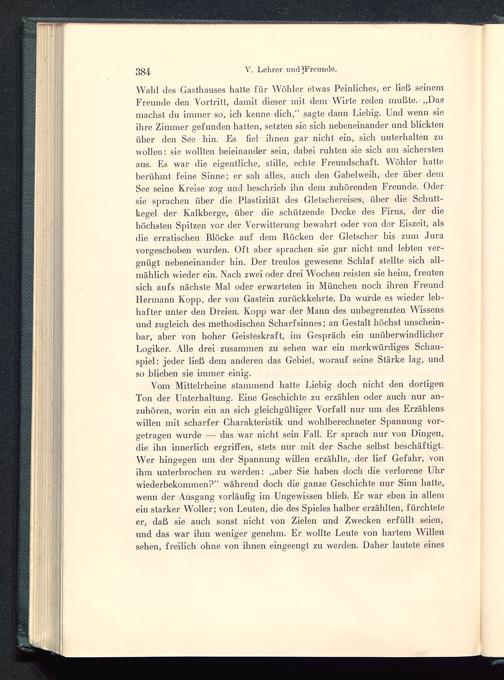 Vom Mittelrheine stammend hatte Liebig doch nicht den dortigenTon der Unterhaltung. Eine Geschichte zu erzählen oder auch nur an-zuhören, worin ein an sich gleichgültiger Vorfall nur um des Erzählenswillen mit scharfer Charakteristik und wohlberechneter Spannung vor-getragen wurde — das war nicht sein Fall. Er sprach nur von Dingen,die ihn innerlich ergriffen, stets nur mit der Sache selbst beschäftigt.Wer hingegen um der Spannung willen erzählte, der lief Gefahr, vonihm unterbrochen zu werden: „aber Sie haben doch die verlorene Uhrwiederbekommen?“ während doch die ganze Geschichte nur Sinn hatte,wenn der Ausgang vorläufig im Ungewissen blieb. Er war eben in allemein starker Woher; von Leuten, die des Spieles halber erzählten, fürchteteer, daß sie auch sonst nicht von Zielen und Zwecken erfüllt seien,und das war ihm weniger genehm. Er wollte Leute von hartem Willensehen, freilich ohne von ihnen eingeengt zu werden. Daher lautete eines