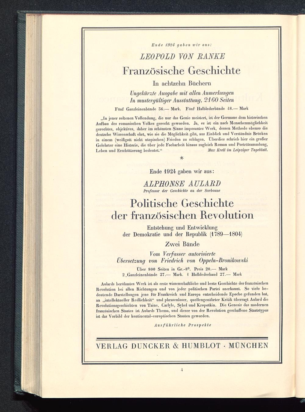 Aulards berühmtes Werk ist als erste wissenschaftliche und beste Geschichte der französischenRevolution bei allen Richtungen und von jeder politischen Partei anerkannt. So viele be-deutende Darstellungen jene für Frankreich und Europa entscheidende Epoche gefunden hat,an „intellektueller Redlichkeit“ und phrasenloser, quellengenährter Kritik überragt Aulard dieReYolutionsgeschichten von Taine, Carlyle, Sybel und Kropotkin. Die Genesis des modernenfranzösischen Staates ist Aulards Thema, und dieser von der Revolution geschaffene Staatstypusist das Vorbild der kontinental-europäischen Staaten geworden.