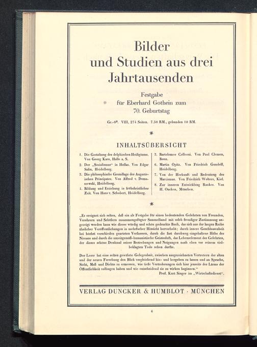 „Es ereignet sich selten, daß ein als Festgabe für einen bedeutenden Gelehrten von Freunden,Verehrern und Schillern zusammengefugter Sammelband mit solch freudiger Zustimmung an-gezeigt werden kann wie dieses würdig und schön gedruckte Buch, das sich aus der langen Reiheähnlicher Veröffentlichungen in mehrfacher Hinsicht hervorhebt; durch innere Geschlossenheitbei höchst verschieden gearteten Verfassern, durch die fast durchweg eingebaltene Höhe desNiveaus und durch die unzeitgemäß-humanistische Geistesluft, das Lebenselement des Gelehrten,der dieses schöne Denkmal seiner Bestrebungen und Neigungen noch eben vor seinem viel-beklagten Tode sehen durfte.
