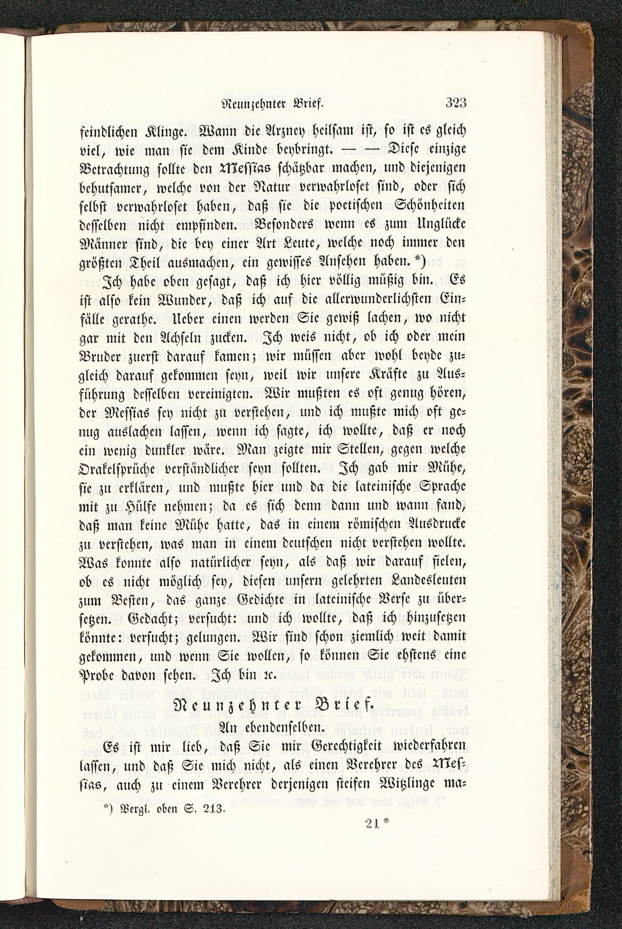 Neunzehnter Brief.An ebendenselben.Es ist mir lieb, daß Sie mir Gerechtigkeit wicdcrfahrcnlassen, und daß Sie mich nicht, als einen Verehrer des Mes-sias, auch zu einem Verehrer derjenigen steifen Witzlinge ma-