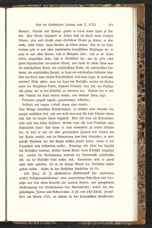 (16. Jan.) p. I. Hollanders Bibliothek fiir unstudirtewahre Religionslicbhaber: oder auserlesene Schriften und Aus-züge aus den alten sowohl als neuern Zeiten, zur gnugsamcnBestätigung der Wahrheiten des Seelenheils/ wider die Un-gläubigen, Juden und Schwärmer. /. //. und Theil. Frank-furt am Map» 1762/ zu finden in der Dürenschen Buchhand-