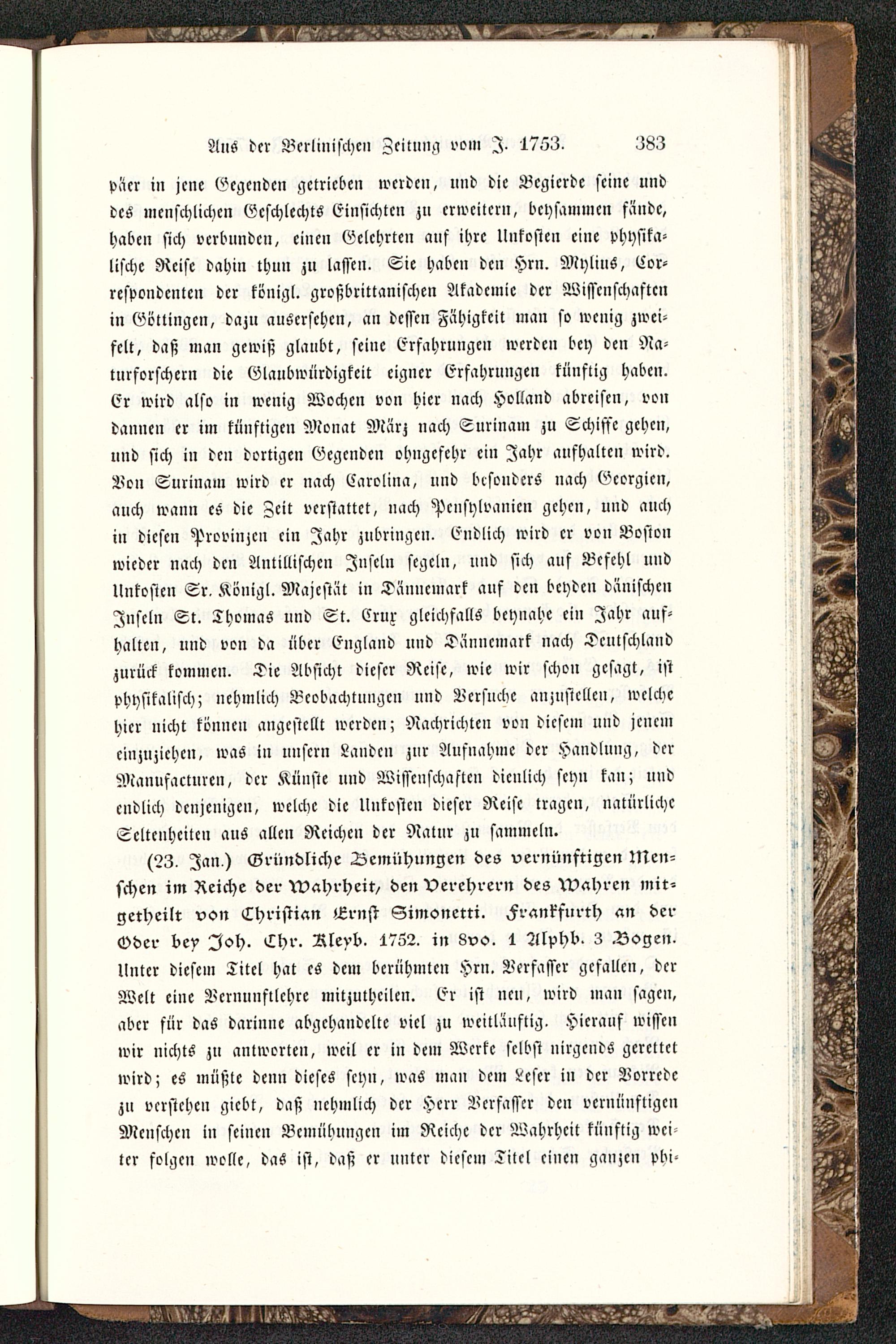 päcr in jene Gegenden getrieben werden, nnd die Begierde seine unddes menschlichen Geschlechts Einsichten jn erweitern, beysammen fände,haben sich vcrbnndc», einen Gelehrten ans ihre Unkosten eine physika-lische Reise dahin thun zn lassen. Sie haben den Hrn. Mylins, Eor-respondcntcn der königl. grofibrittanischen Akademie der Wissenschaftenin Göttingen , dazu auscrschcn, an dessen Fähigkeit man so wenig zwei-felt, daß man gewiß glaubt, seine Erfahrungen werden bey den Na-turforschern die Glaubwürdigkeit eigner Erfahrungen künftig haben.Er wird also in wenig Wochen von hier nach Holland abreisen, vondannen er im künftigen Monat März nach Cnrinam zu Schiffe gehe»,und sich iu den dortigen Gegenden ohngcfchr ein Jahr aufhalten wird.Von Surinam wird er nach Earolina, und besonders nach Georgien,auch wann cS die Zeit verstattet, »ach Pcnsylvanicn gehen, und auchiu diese» Provinzen ein Jahr zubringen. Endlich wird er von Boston wieder nach den Antillischcn Inseln segeln, und sich auf Befehl undUnkosten Sr. König!. Majestät in Tänncmark auf den beyden dänischenInseln St. Thomas und St. Crux gleichfalls beynahe ein Jahr auf-halte», und von da über England und Vänncmark nach Deutschland zurück kommen. ?ie Absicht dieser Reise, wie wir schon gesagt, istphysikalisch; nehmlich Beobachtungen und Versuche aiijusicllc», wclcbchier nicht können angestellt werden; Nachrichten von diesem und jenemcinzujichc», was iu unser» Lande» zur Aufnahme der Handlung, derManufacturcu, der Künste nnd Wisscnschaftc» dienlich seyn kan; undendlich denjenigen, welche die Unkosten dieser Reise tragen, natürlicheSeltenheiten ans allen Reichen der Ratnr zn sammeln.