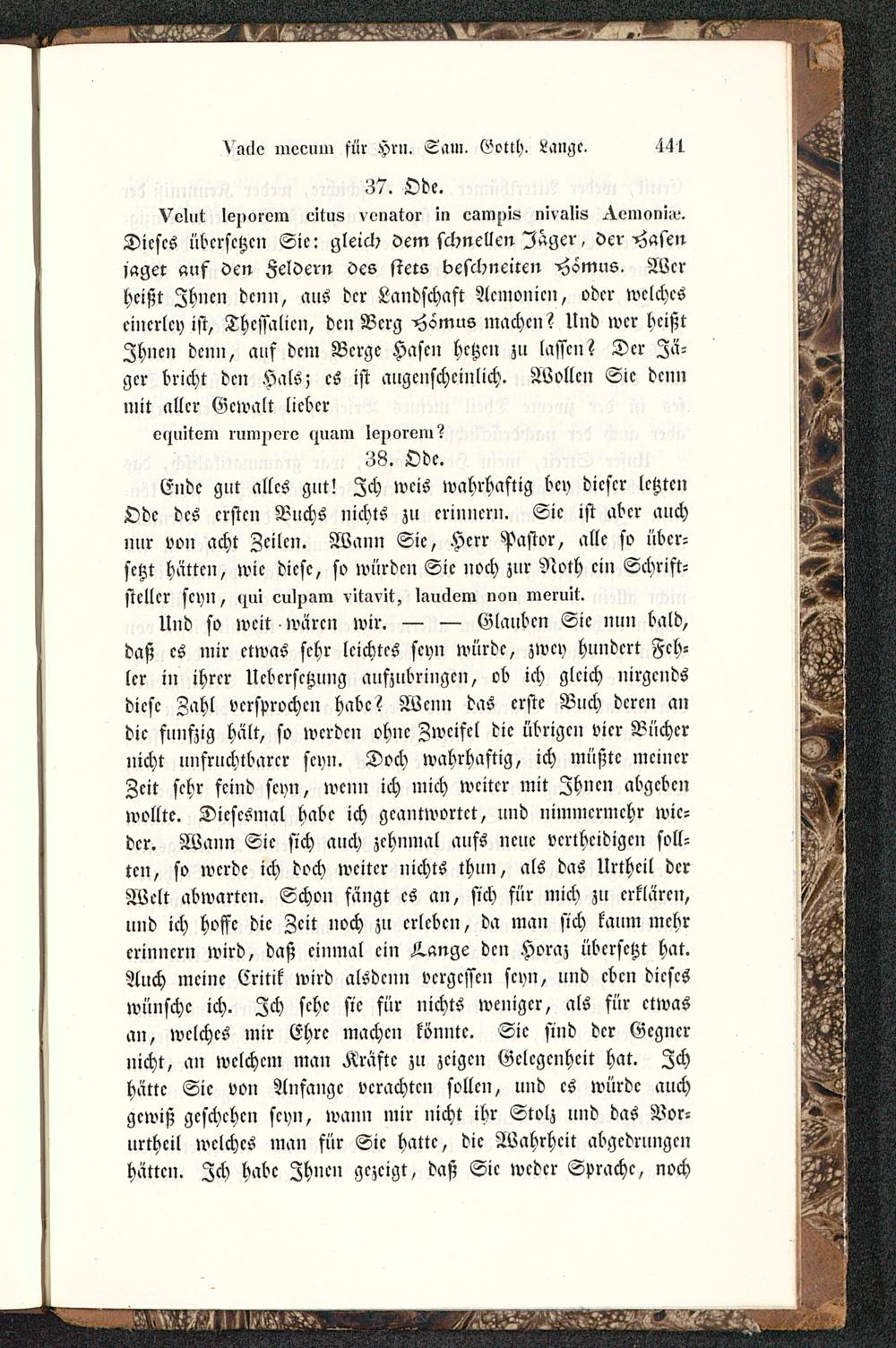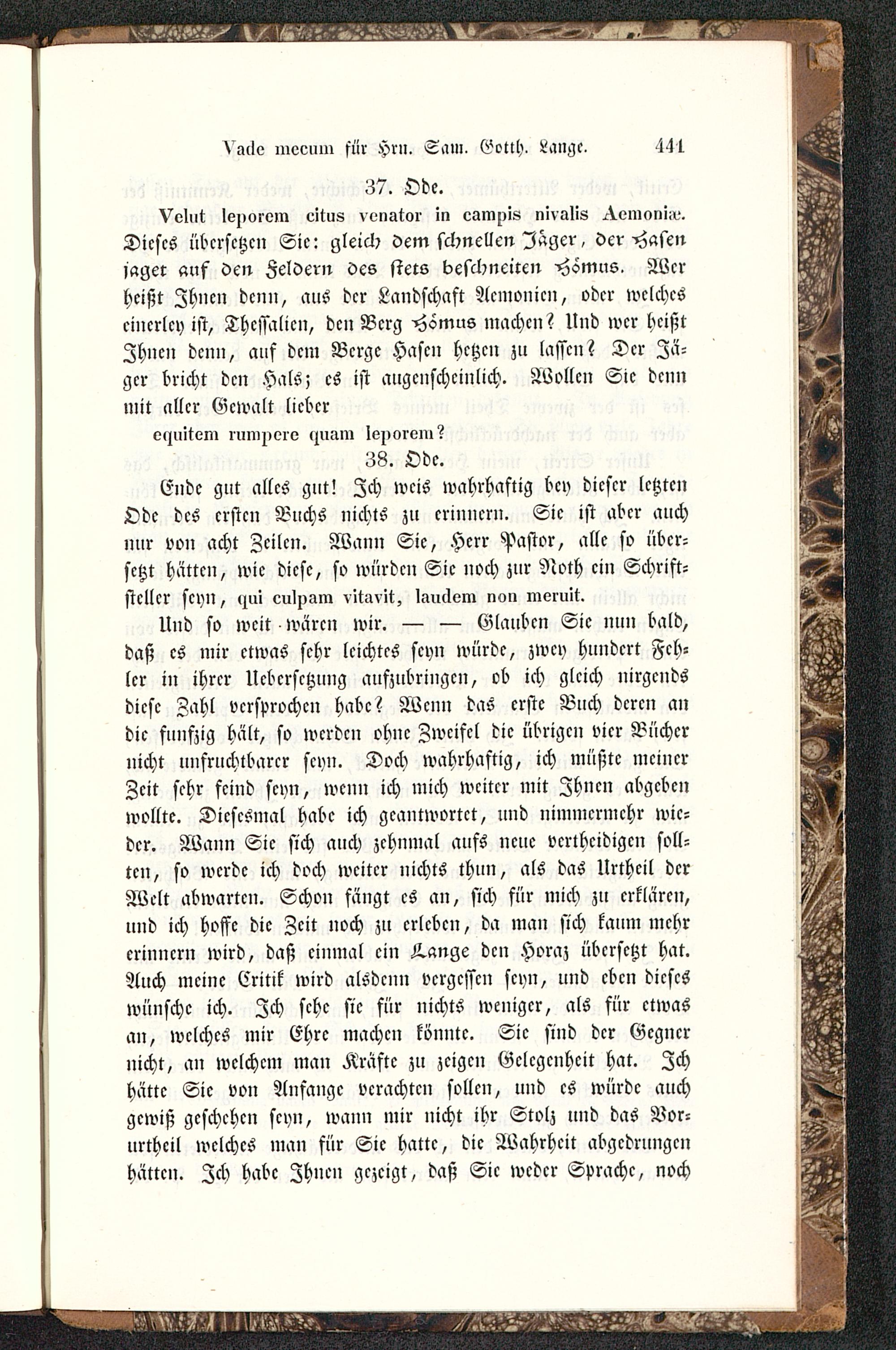 Ende gut alles gut! Zch weis wahrhaftig bey dieser letztenOde des ersten Buchs nichts zu erinnern. Sie ist aber michnur von acht Zeilen. Wann Sie, Herr Pastor, alle so über-setzt hätten, wie diese, so würden Sie noch zur Noth ein Schrift-steller seyn, «nli culnam vitinit, lauclvm non merult.