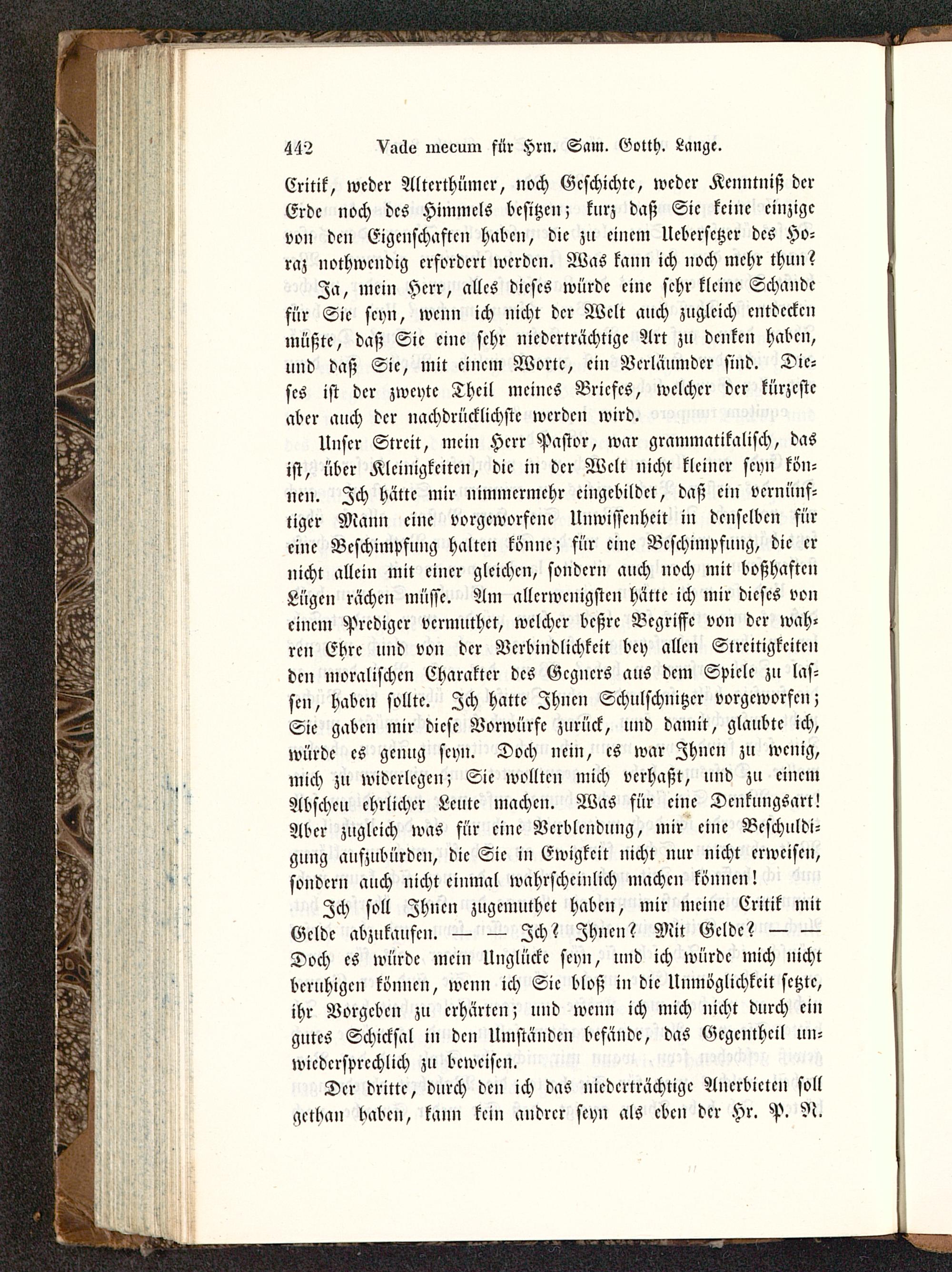 Unser Streit, mein Herr Pastor, war grammatikalisch, dasist, über Kleinigkeiten, die in der Welt nicht kleiner seyn kön-nen. Ich hätte mir nimmermehr eingebildet, daß ein vernünf-tiger Mann eine vorgeworfene Unwissenheit in denselben füreine Beschimpfung halten könne; für eine Beschimpfung, die ernicht allein mit einer gleichen, sondern auch noch mit boßhaftcnLügen rächen müsse. Am allerwenigsten hätte ich mir dieses voneinem Prediger vermuthet, welcher bcßrc Begriffe von der wah-ren Ehre und von der Verbindlichkeit bey allen Streitigkeitenden moralischen Charakter des Gegners aus dem Spiele zu las-sen, haben sollte. Ich hatte Ihnen Schulschnitzcr vorgeworfen;Sie gaben mir diese Vorwürfe zurück, und damit, glaubte ich,würde es genug seyn. Doch nein, es war Ihnen zu wenig,mich zu widerlegen; Sie wollten mich verhaßt, und zu einemAbscheu ehrlicher Leute machen. Was für eine Dcnkungsart!Aber zugleich was für eine Verblendung, mir eine Beschuldi-gung aufzubürden, die Sie in Ewigkeit nicht nur nicht erweisen,sonder» auch nicht einmal wahrscheinlich machen können!