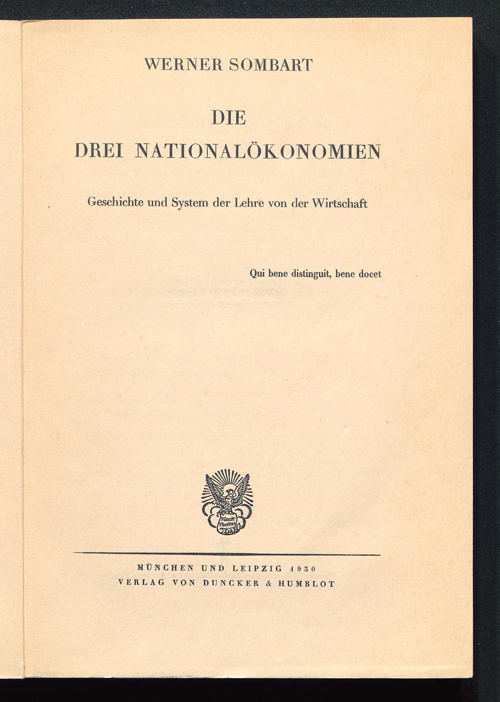 WERNER SOMBART DIEDREI NATIONALÖKONOMIENGeschichte und System der Lehre von der WirtschaftQui bene distinguit, bene docetMÜNCHEN UND LEIPZIG 1930VERLAG VON DIJNCKER & H UMBLOT