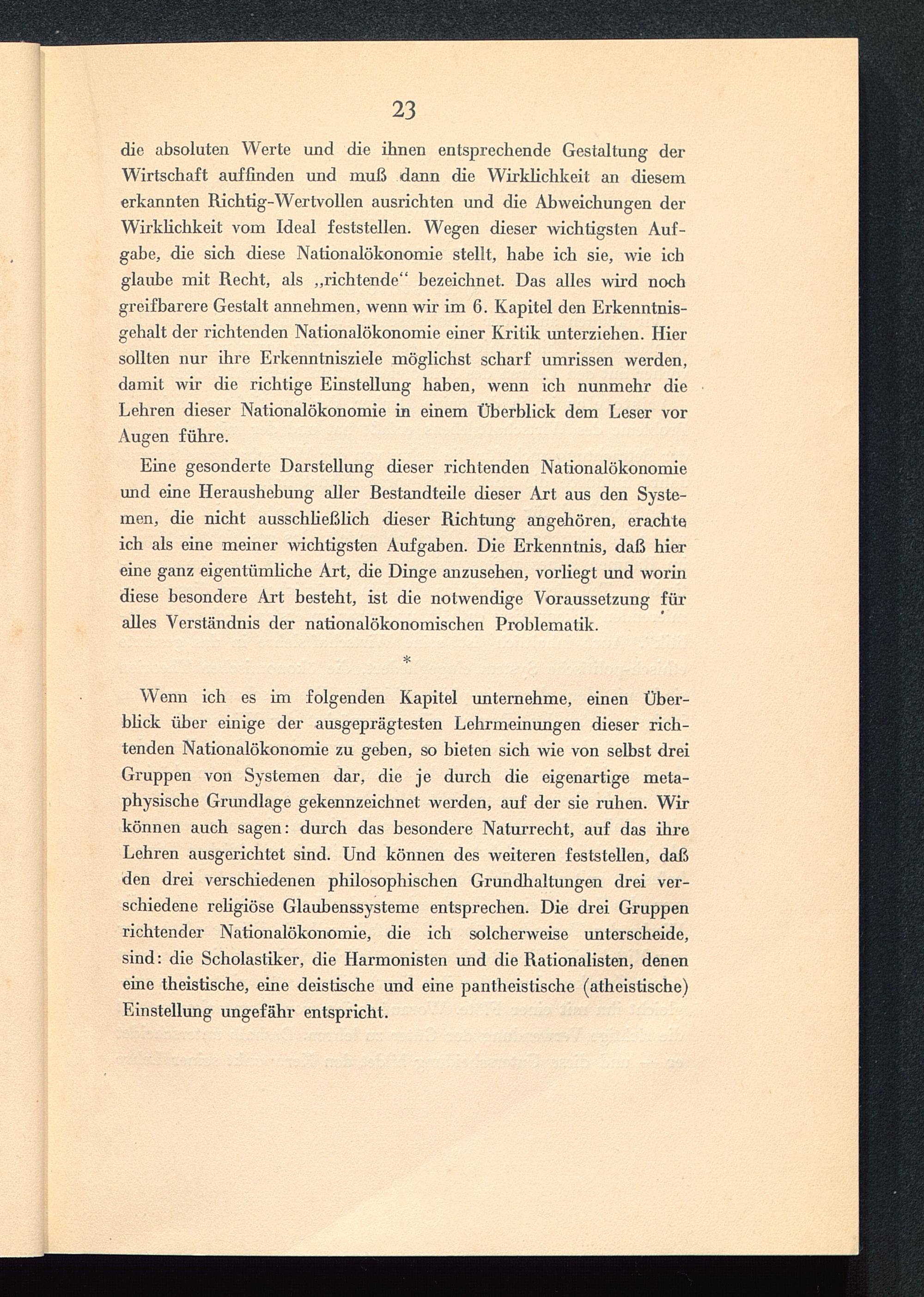Wenn ich es im folgenden Kapitel unternehme, einen Über-blick über einige der ausgeprägtesten Lehrmeinungen dieser rich-tenden Nationalökonomie zu geben, so bieten sich wie von selbst dreiGruppen von Systemen dar, die je durch die eigenartige meta-physische Grundlage gekennzeichnet werden, auf der sie ruhen. Wirkönnen auch sagen: durch das besondere Naturrecht, auf das ihreLehren ausgerichtet sind. Und können des weiteren feststellen, daßden drei verschiedenen philosophischen Grundhaltungen drei ver-schiedene religiöse Glaubenssysteme entsprechen. Die drei Gruppenrichtender Nationalökonomie, die ich solcherweise unterscheide,sind: die Scholastiker, die Harmonisten und die Rationalisten, deneneine theistische, eine deistische und eine pantheistische (atheistische)Einstellung ungefähr entspricht.