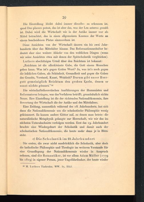 Eine Zeitlang, namentlich während des 18. Jahrhunderts, hat sichdann die Nationalökonomie um die scholastische Philosophie weniggekümmert. Es kamen andere Götter auf, zu denen man betete: dienaturalistische Metaphysik gelangte zur Herrschaft, wie wir das imnächsten Unterabschnitte verfolgen werden. Erst das ig. Jahrhundertbrachte eine Wiedergeburt der Scholastik und damit auch derscholastischen Nationalökonomie, die heute mehr denn je in Blütesteht.