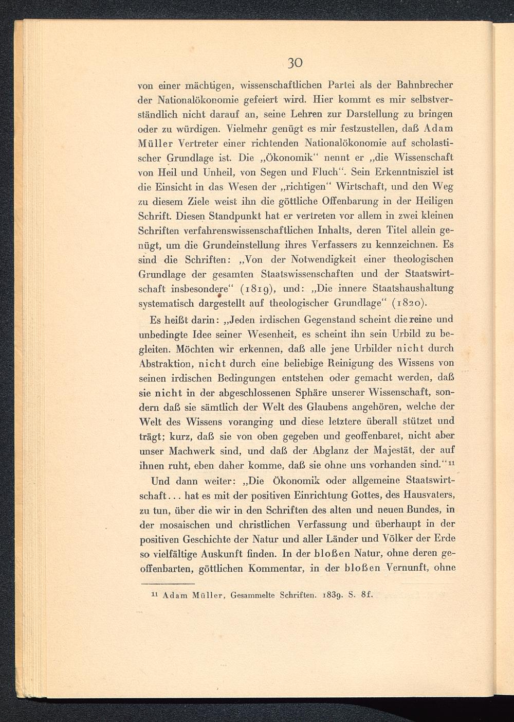 von einer mächtigen, wissenschaftlichen Partei als der Bahnbrecherder Nationalökonomie gefeiert wird. Hier kommt es mir selbstver-ständlich nicht darauf an, seine Lehren zur Darstellung zu bringenoder zu würdigen. Vielmehr genügt es mir festzustellen, daß AdamMüller Vertreter einer richtenden Nationalökonomie auf scholasti-scher Grundlage ist. Die „Ökonomik “ nennt er „die Wissenschaftvon Heil und Unheil, von Segen und Fluch“. Sein Erkenntnisziel istdie Einsicht in das Wesen der „richtigen“ Wirtschaft, und den Wegzu diesem Ziele weist ihn die göttliche Offenbarung in der HeiligenSchrift. Diesen Standpunkt hat er vertreten vor allem in zwei kleinenSchriften verfahrenswissenschaftlichen Inhalts, deren Titel allein ge-nügt, um die Grundeinstellung ihres Verfassers zu kennzeichnen. Essind die Schriften: „Von der Notwendigkeit einer theologischenGrundlage der gesamten Staatswissenschaften und der Staatswirt-schaft insbesondere“ (1819), und: „Die innere Staatshaushaltungsystematisch dargestellt auf theologischer Grundlage“ (1820).