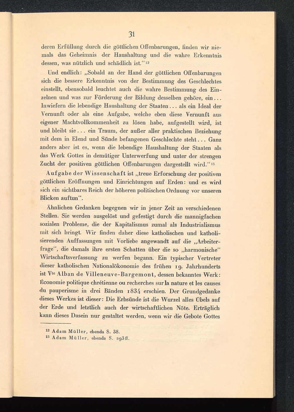 Ähnlichen Gedanken begegnen wir in jener Zeit an verschiedenenStellen. Sie werden ausgelöst und gefestigt durch die mannigfachensozialen Probleme, die der Kapitalismus zumal als Industrialismusmit sich bringt. Wir finden daher diese katholischen und katholi-sierenden Auffassungen mit Vorliebe angewandt auf die „Arbeiter-frage “, die damals ihre ersten Schatten über die so „harmonische“Wirtschaftsverfassung zu werfen begann. Ein typischer Vertreterdieser katholischen Nationalökonomie des frühen ig. Jahrhundertsist V te Alban de Villeneuve-Bargemont, dessen bekanntes Werk:ßconomie politique chretienne ou recherches surla nature et les causesdu pauperisme in drei Bänden i834 erschien. Der Grundgedankedieses Werkes ist dieser: Die Erbsünde ist die Wurzel alles Übels aufder Erde und letztlich auch der wirtschaftlichen Nöte. Erträglichkann dieses Dasein nur gestaltet werden, wenn wir die Gebote Gottes