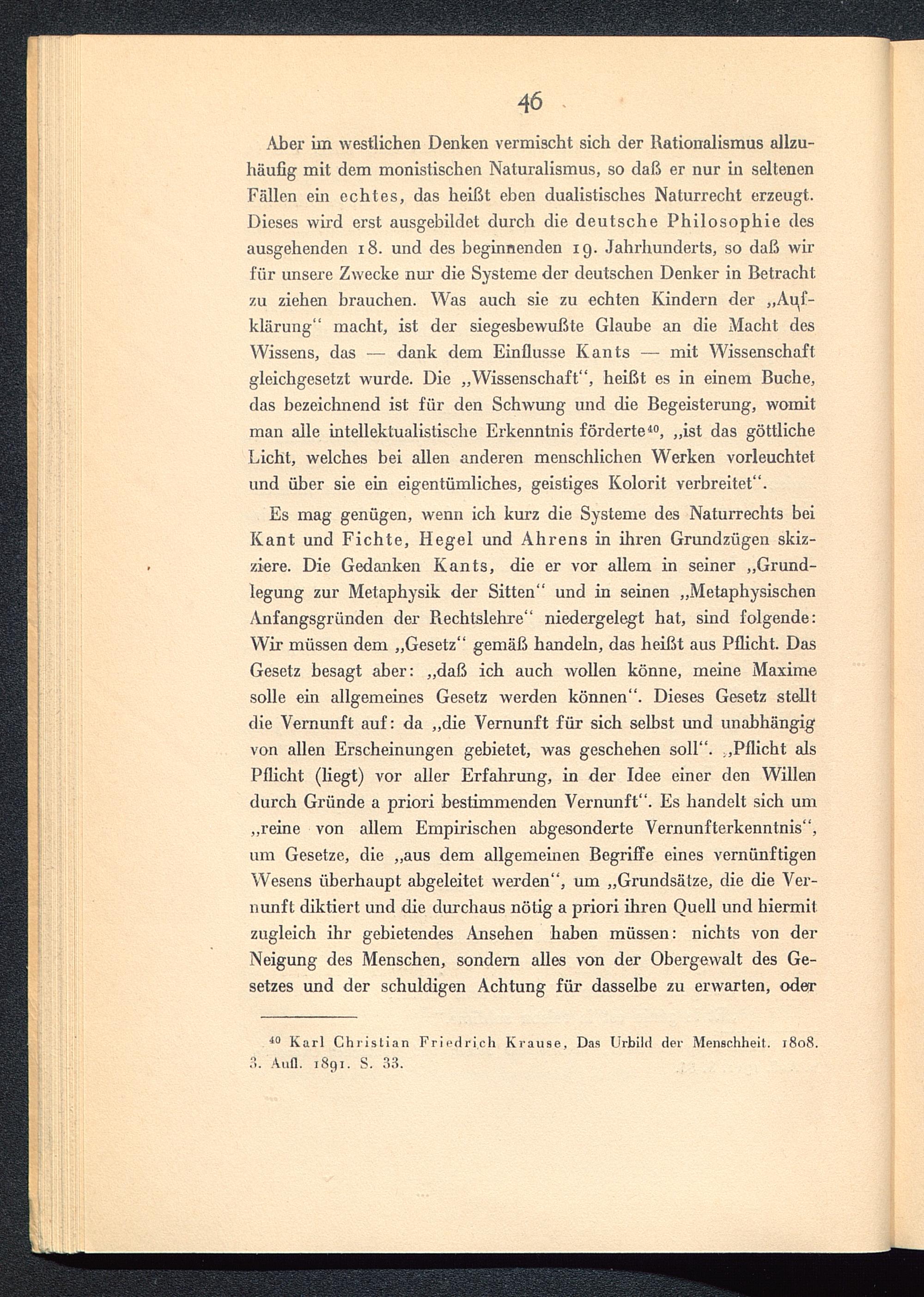 Es mag genügen, wenn ich kurz die Systeme des Naturrechts beiKant und Fichte, Hegel und Ahrens in ihren Grundzügen skiz-ziere. Die Gedanken Kants , die er vor allem in seiner „Grund-legung zur Metaphysik der Sitten“ und in seinen „MetaphysischenAnfangsgründen der Piechtslehre“ niedergelegt hat, sind folgende:Wir müssen dem „Gesetz“ gemäß handeln, das heißt aus Pflicht. DasGesetz besagt aber: „daß ich auch wollen könne, meine Maximesolle ein allgemeines Gesetz werden können“. Dieses Gesetz stelltdie Vernunft auf: da „die Vernunft für sich selbst und unabhängigvon allen Erscheinungen gebietet, was geschehen soll“. „Pflicht alsPflicht (liegt) vor aller Erfahrung, in der Idee einer den Willendurch Gründe a priori bestimmenden Vernunft“. Es handelt sich um„reine von allem Empirischen abgesonderte Vernunfterkenntnis“,um Gesetze, die „aus dem allgemeinen Begriffe eines vernünftigenWesens überhaupt abgeleitet werden“, um „Grundsätze, die die Ver-nunft diktiert und die durchaus nötig a priori ihren Quell und hiermitzugleich ihr gebietendes Ansehen haben müssen: nichts von derNeigung des Menschen, sondern alles von der Obergewalt des Ge-setzes und der schuldigen Achtung für dasselbe zu erwarten, oder