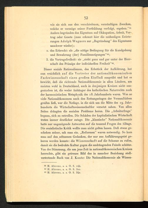 Dieser soziale Rationalismus, das Erbstück der Aufklärung, hatnun ersichtlich auf die Vertreter der nationalökonomischenFachwissenschaft einen großen Einfluß ausgeübt und hat esbewirkt, daß die richtende Nationalökonomie in allen Ländern, ammeisten wohl in Deutschland , auch in denjenigen Kreisen nicht aus-gestorben ist, die weder Anhänger des katholischen Naturrechts nochder harmonistischen Metaphysik des 18. Jahrhunderts waren. Was soviele Nationalökonomen nach den Rettungsringen der Vernunftideengreifen ließ, war die Notlage, in die sich um die Mitte des 19. Jahr-hunderts die Wirtschaftswissenschaftler versetzt sahen. Von allenSeiten drängten die sozialen Probleme heran. Die „Arbeiterfrage “begann, sich zu entrollen. Die Schäden der kapitalistischen Wirtschafttraten immer deutlicher zutage. Die „klassische“ Nationalökonomiehatte nur ungenügende Antworten auf die tausend Fragen des Alltags.Die sozialistische Kritik wollte man nicht gelten lassen. Daß etwas ge-schehen müsse, sah man ein. „Reformen“ waren notwendig. So kamman auf den seltsamen Gedanken, der nur aus Aufklärungsgeist ge-boren werden konnte: die Wissenschaft auf die Schanze zu rufen,damit sie die bedrohte Kultur gegen die andrängenden Feinde schütze.Von der Stimmung, die um jene Zeit in nationalökonomischen Kreisenherrschte, gibt ein getreues Bild das in mancher Beziehung stell-vertretende Buch von J. Kautz: Die Nationalökonomie als Wissen-