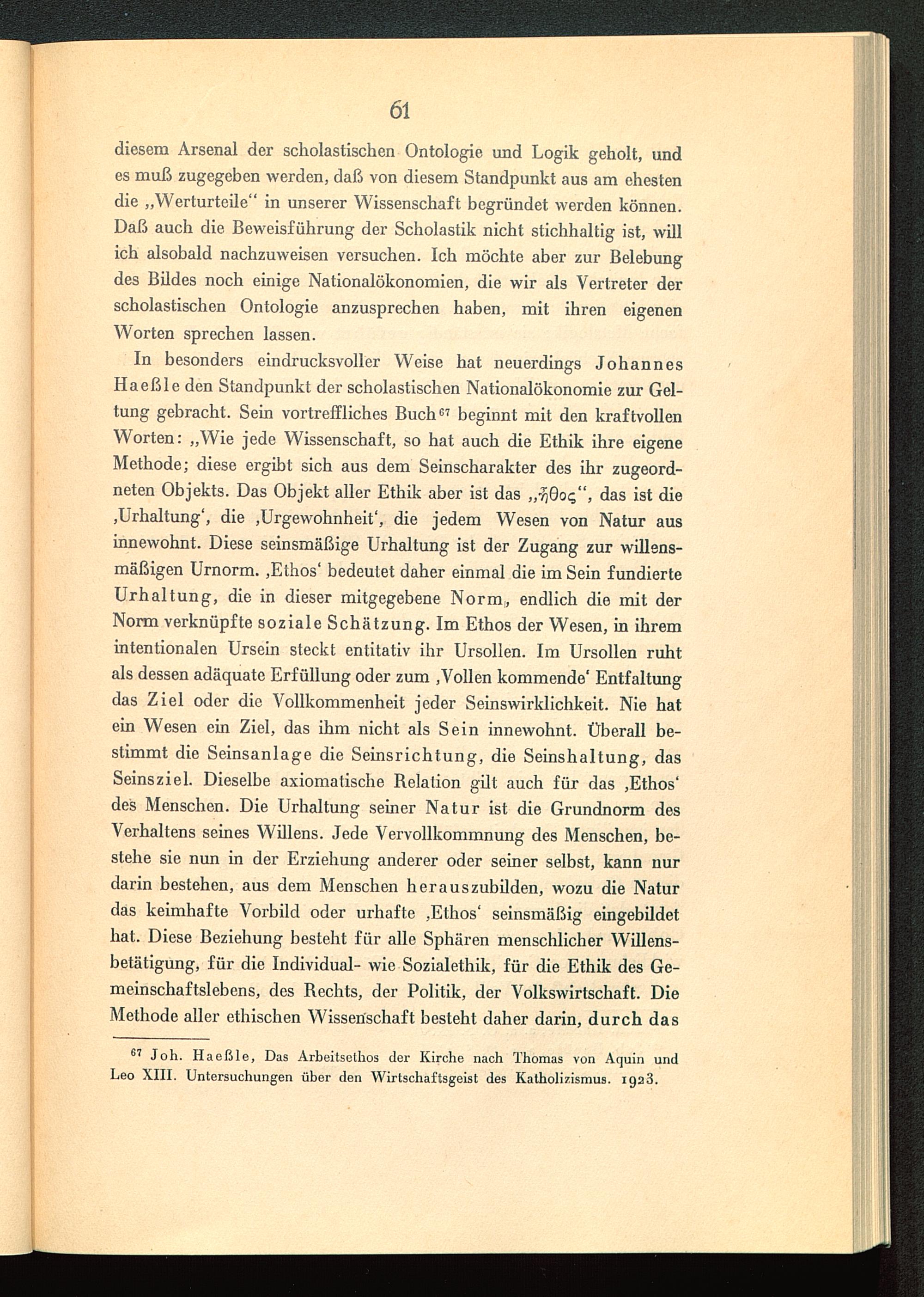 In besonders eindrucksvoller Weise hat neuerdings JohannesHaeßle den Standpunkt der scholastischen Nationalökonomie zur Gel-tung gebracht. Sein vortreffliches Buch 67 beginnt mit den kraftvollenWorten: „Wie jede Wissenschaft, so hat auch die Ethik ihre eigeneMethode; diese ergibt sich aus dem Seinscharakter des ihr zugeord-neten Objekts. Das Objekt aller Ethik aber ist das ,,^0o<;“, das ist die,Urhaltung‘, die ,Urgewohnheit‘, die jedem Wesen von Natur ausinnewohnt. Diese seinsmäßige Urhaltung ist der Zugang zur willens-mäßigen Urnorm. ,Ethos' bedeutet daher einmal die im Sein fundierteUrhaltung, die in dieser mitgegebene Norm,, endlich die mit derNorm verknüpfte soziale Schätzung. Im Ethos der Wesen, in ihremintentionalen Ursein steckt entitativ ihr Ursollen. Im Ursollen ruhtals dessen adäquate Erfüllung oder zum .Vollen kommende' Entfaltungdas Ziel oder die Vollkommenheit jeder Seinswirklichkeit. Nie hatein Wesen ein Ziel, das ihm nicht als Sein innewohnt. Überall be-stimmt die Seinsanlage die Seinsrichtung, die Seinshaltung, dasSeinsziel. Dieselbe axiomatische Relation gilt auch für das ,Ethos'des Menschen. Die Urhaltung seiner Natur ist die Grundnorm desVerhaltens seines Willens. Jede Vervollkommnung des Menschen, be-stehe sie nun in der Erziehung anderer oder seiner selbst, kann nurdarin bestehen, aus dem Menschen herauszubilden, wozu die Naturdas keimhafte Vorbild oder urhafte ,Ethos' seinsmäßig eingebildethat. Diese Beziehung besteht für alle Sphären menschlicher Willens-betätigung, für die Individual- wie Sozialethik, für die Ethik des Ge-meinschaftslebens, des Rechts, der Politik, der Volkswirtschaft. DieMethode aller ethischen Wissenschaft besteht daher darin, durch das
