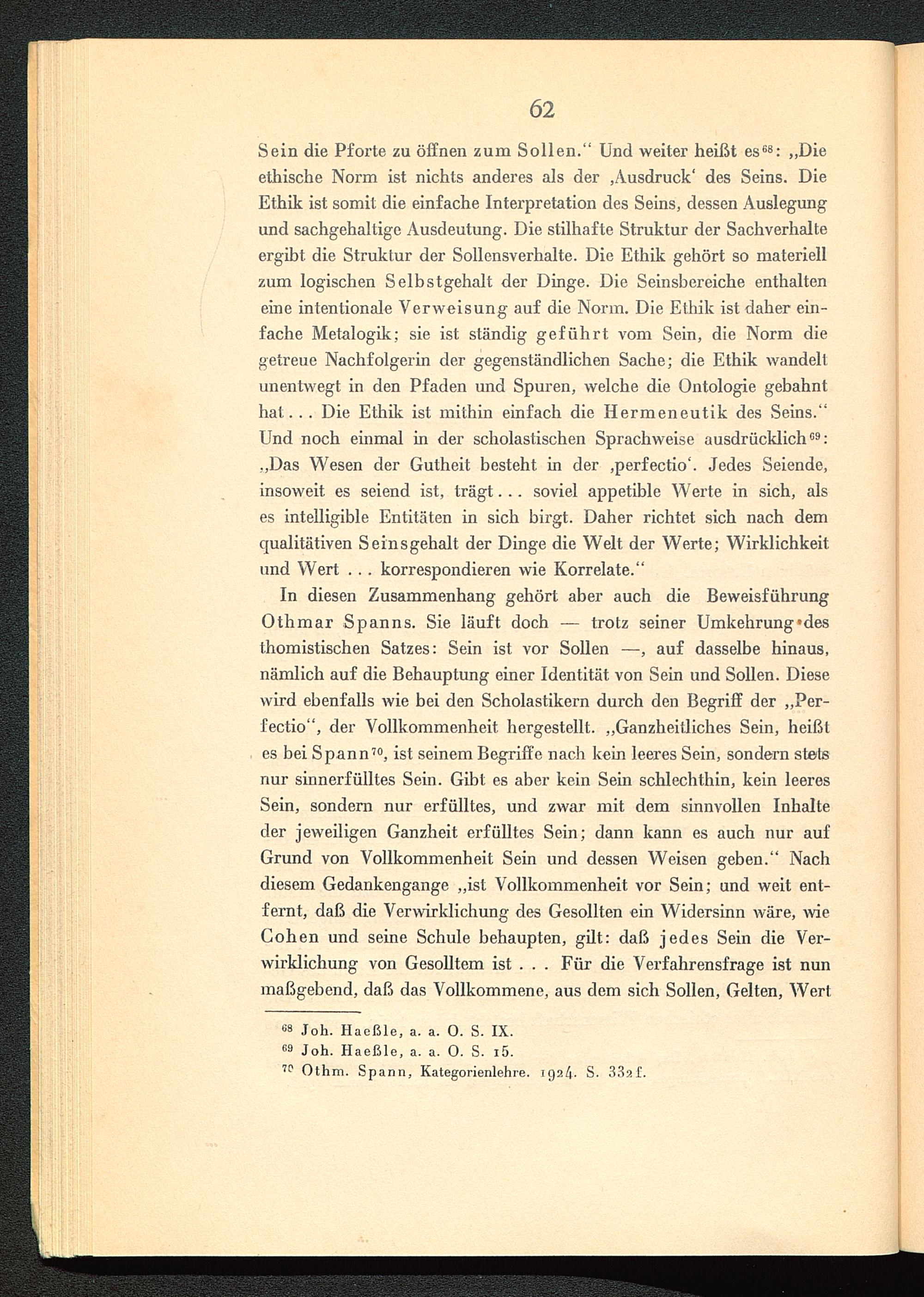 In diesen Zusammenhang gehört aber auch die BeweisführungOthmar Spanns. Sie läuft doch — trotz seiner Umkehrung »desthomistischen Satzes: Sein ist vor Sollen —, auf dasselbe hinaus,nämlich auf die Behauptung einer Identität von Sein und Sollen. Diesewird ebenfalls wie bei den Scholastikern durch den Begriff der „Per-fectio“, der Vollkommenheit hergestellt. „Ganzheitliches Sein, heißtes bei Spann 70 , ist seinem Begriffe nach kein leeres Sein, sondern stetsnur sinnerfülltes Sein. Gibt es aber kein Sein schlechthin, kein leeresSein, sondern nur erfülltes, und zwar mit dem sinnvollen Inhalteder jeweiligen Ganzheit erfülltes Sein; dann kann es auch nur aufGrund von Vollkommenheit Sein und dessen Weisen geben.“ Nachdiesem Gedankengange „ist Vollkommenheit vor Sein; und weit ent-fernt, daß die Verwirklichung des Gesollten ein Widersinn wäre, wieCohen und seine Schule behaupten, gilt: daß jedes Sein die Ver-wirklichung von Gesolltem ist . . . Für die Verfahrensfrage ist nunmaßgebend, daß das Vollkommene, aus dem sich Sollen, Gelten, Wert