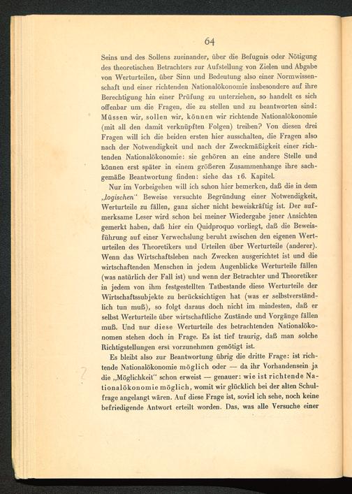 Seins und des Sollens zueinander, über die Befugnis oder Nötigungdes theoretischen Betrachters zur Aufstellung von Zielen und Abgabevon Werturteilen, über Sinn und Bedeutung also einer Normwissen-schaft und einer richtenden Nationalökonomie insbesondere auf ihreBerechtigung hin einer Prüfung zu unterziehen, so handelt es sichoffenbar um die Fragen, die zu stellen und zu beantworten sind:Müssen wir, sollen wir, können wir richtende Nationalökonomie(mit all den damit verknüpften Folgen) treiben? Von diesen dreiFragen will ich die beiden ersten hier ausschalten, die Fragen alsonach der Notwendigkeit und nach der Zweckmäßigkeit einer rich-tenden Nationalökonomie: sie gehören an eine andere Stelle undkönnen erst später in einem größeren Zusammenhänge ihre sach-gemäße Beantwortung finden: siehe das 16. Kapitel