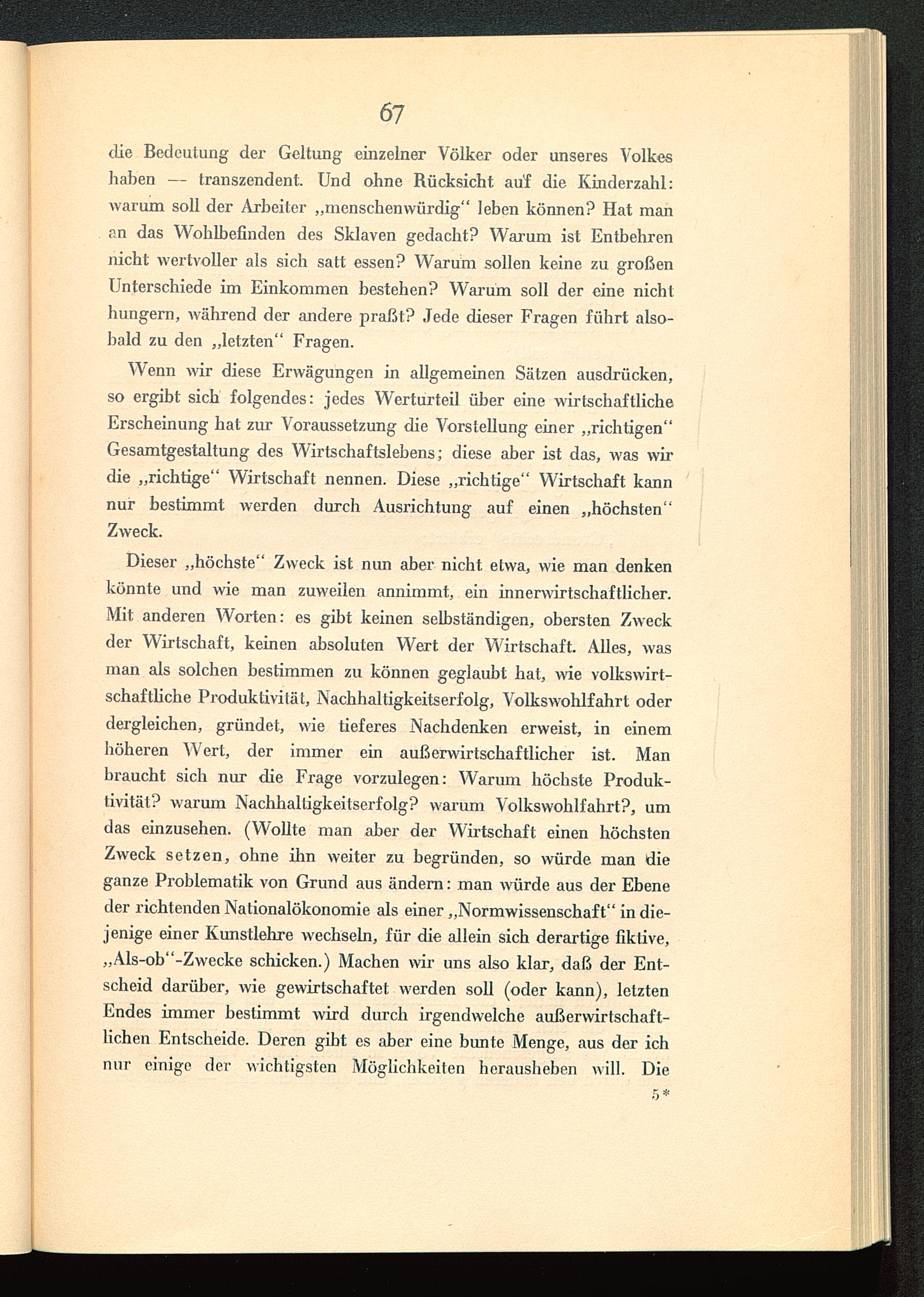Wenn wir diese Erwägungen in allgemeinen Sätzen ausdrücken,so ergibt sich folgendes: jedes Werturteil über eine wirtschaftlicheErscheinung hat zur Voraussetzung die Vorstellung einer „richtigen“Gesamtgestaltung des Wirtschaftslebens; diese aber ist das, was wirdie „richtige“ Wirtschaft nennen. Diese „richtige“ Wirtschaft kannnur bestimmt werden durch Ausrichtung auf einen „höchsten“Zweck.