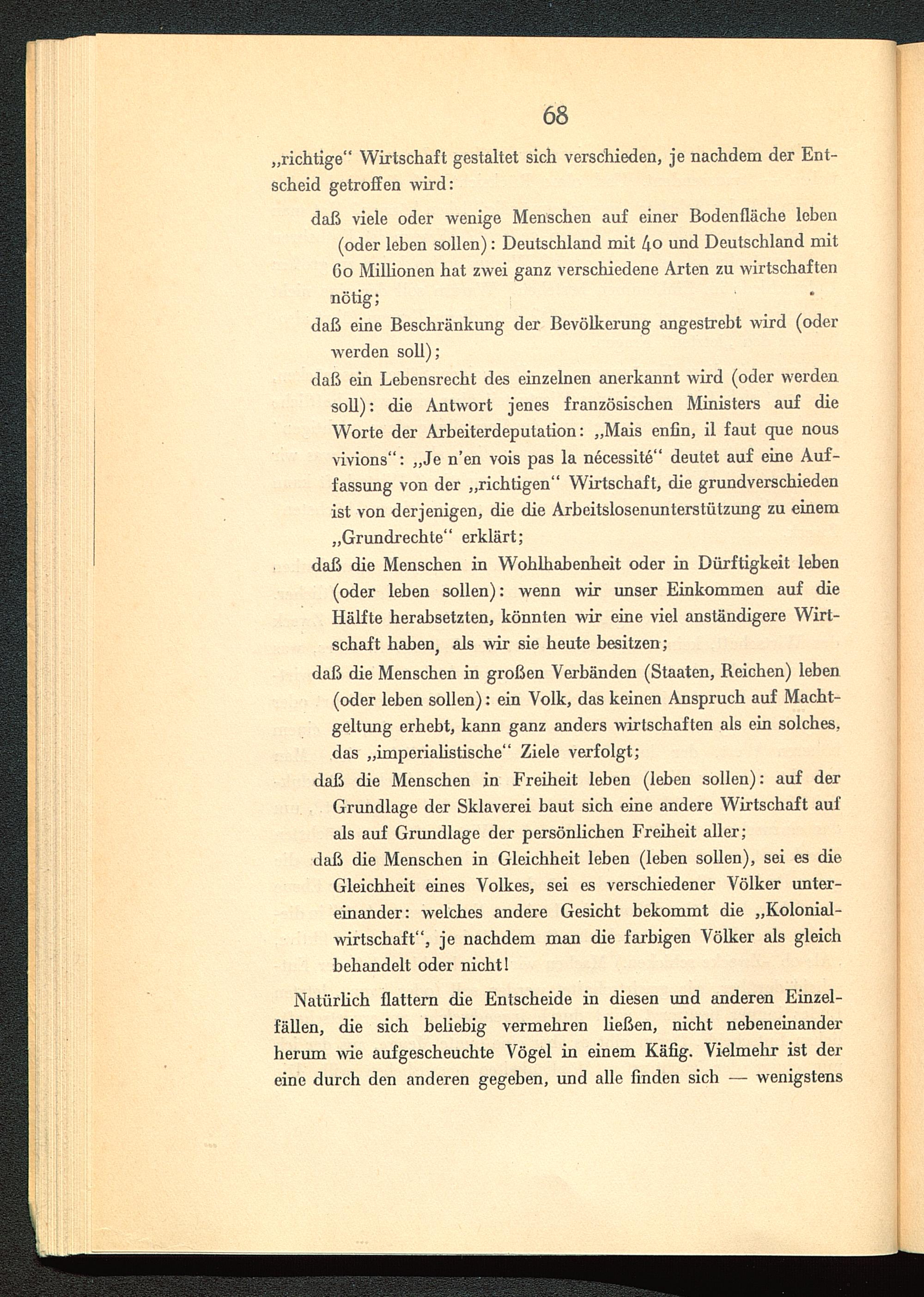 daß die Menschen in großen Verbänden (Staaten, Reichen) leben(oder leben sollen): ein Volk, das keinen Anspruch auf Macht-geltung erhebt, kann ganz anders wirtschaften als ein solches,das „imperialistische“ Ziele verfolgt;