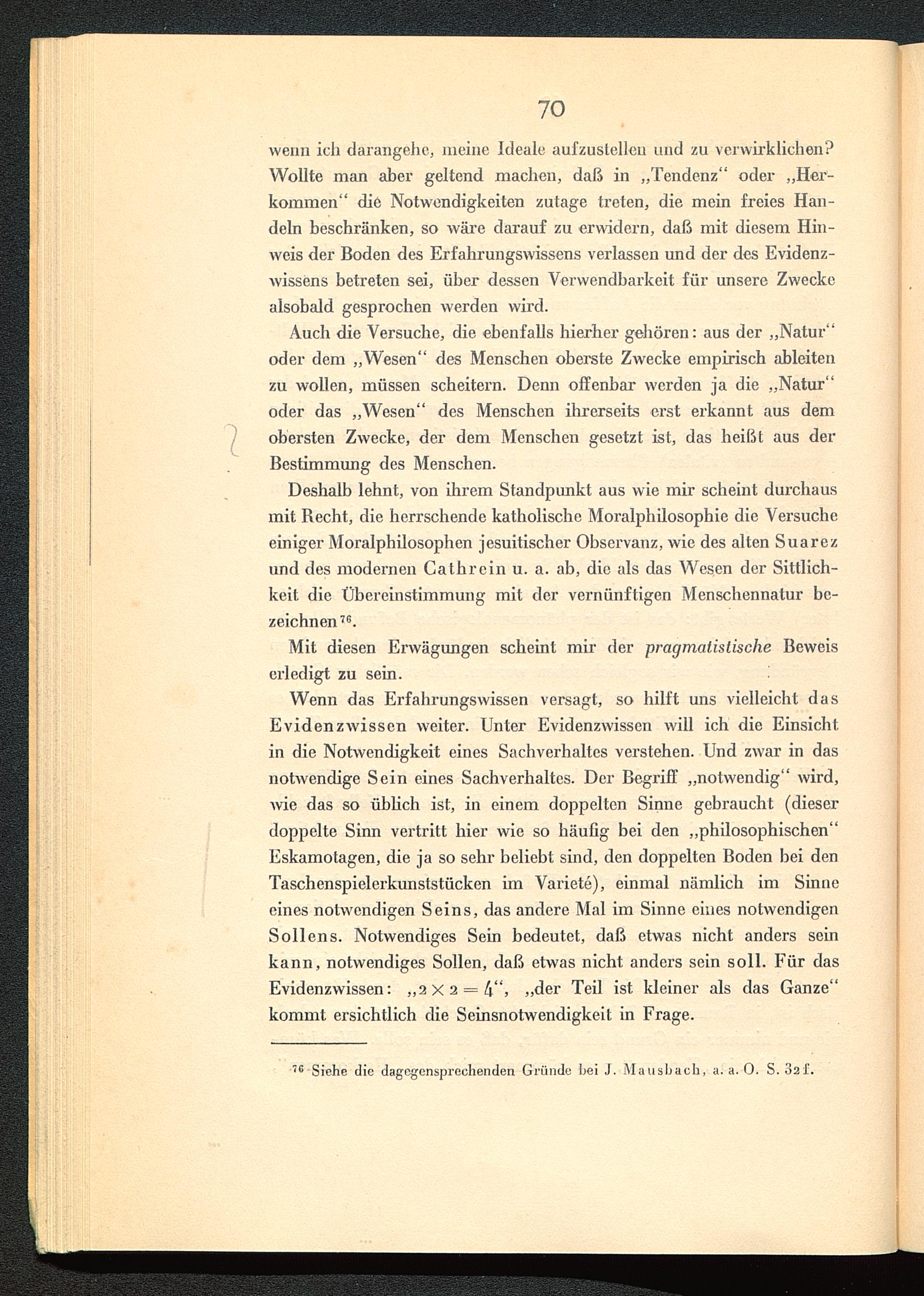 Deshalb lehnt, von ihrem Standpunkt aus wie mir scheint durchausmit Becht, die herrschende katholische Moralphilosophie die Versucheeiniger Moralphilosophen jesuitischer Observanz, wie des alten Suarezund des modernen Cathrein u. a. ab, die als das Wesen der Sittlich-keit die Übereinstimmung mit der vernünftigen Menschennatur be-zeichnen 76 .