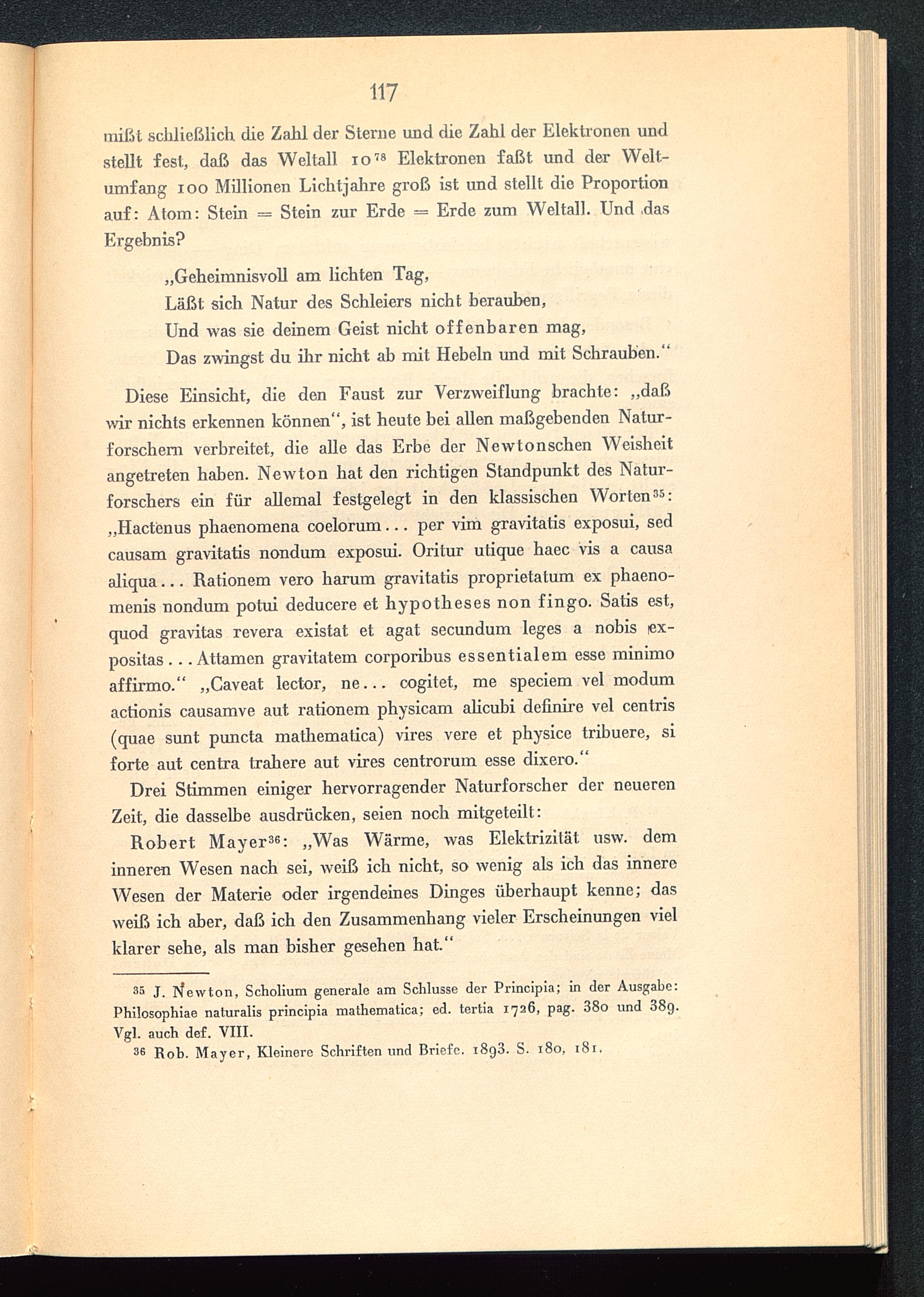 Diese Einsicht, die den Faust zur Verzweiflung brachte: „daßwir nichts erkennen können“, ist heute bei allen maßgebenden Natur-forschern verbreitet, die alle das Erbe der Newtonschen Weisheitangetreten haben. Newton hat den richtigen Standpunkt des Natur-forschers ein für allemal festgelegt in den klassischen Worten 35 :„Hactenus phaenomena coelorum... per vim gravitatis exposui, sedcausam gravitatis nondum exposui. Oritur utique haec vis a causaaliqua... Rationem vero harum gravitatis proprietatum ex phaeno-menis nondum potui deducere et hypotheses non fingo. Satis est,quod gravitas revera existat et agat secundum leges a nobis iex-positas ... Attamen gravitatem corporibus essentialem esse minimoaffirmo.“ „Caveat lector, ne... cogitet, me speciem vel modumactionis causamve aut rationem physicam alicubi definire vel centris(quae sunt puncta mathematica) vires vere et physice tribuere, siforte aut centra trällere aut vires centrorum esse dixero.“
