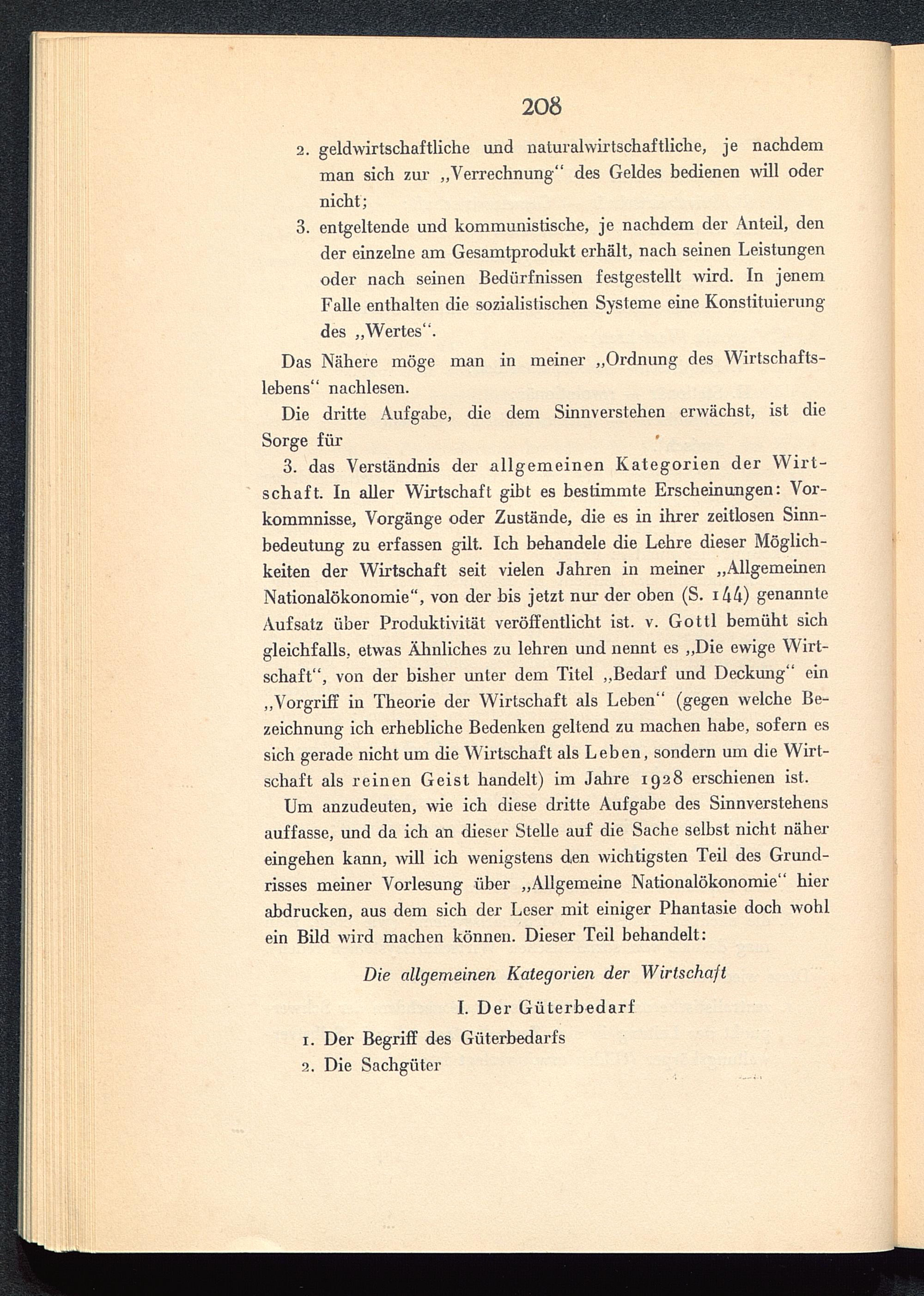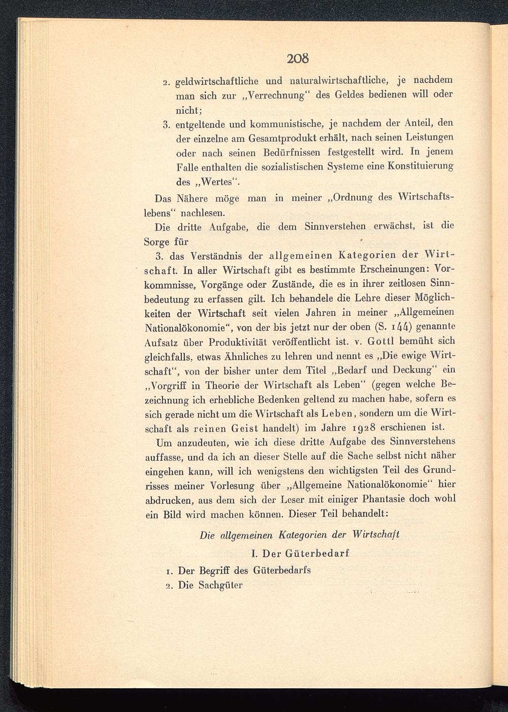 Um anzudeuten, wie ich diese dritte Aufgabe des Sinnverstehensauffasse, und da ich an dieser Stelle auf die Sache selbst nicht nähereingehen kann, will ich wenigstens den wichtigsten Teil des Grund-risses meiner Vorlesung über „Allgemeine Nationalökonomie“ hierabdrucken, aus dem sich der Leser mit einiger Phantasie doch wohlein Bild wird machen können. Dieser Teil behandelt:
