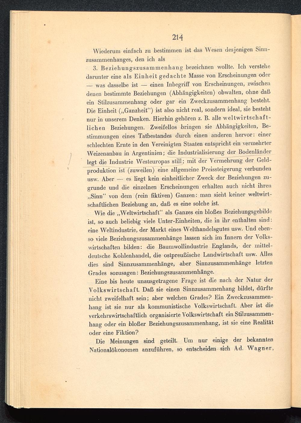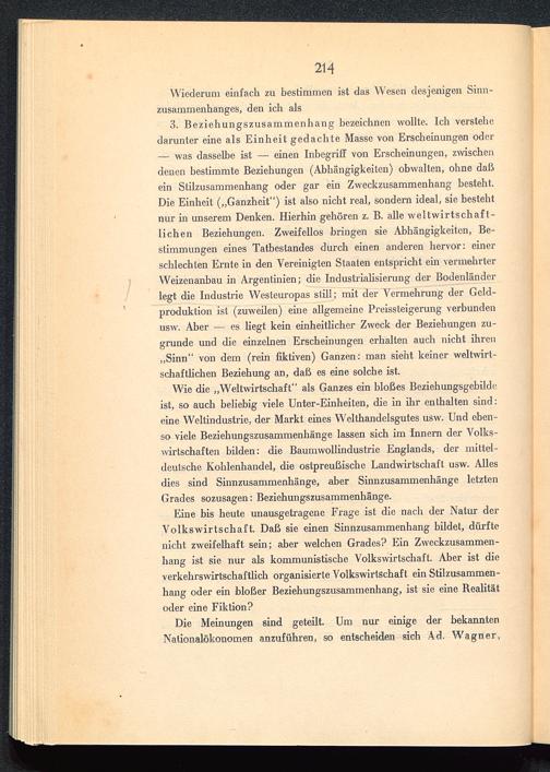 Wie die „Weltwirtschaft “ als Ganzes ein bloßes Beziehungsgebildeist, so auch beliebig viele Unter-Einheiten, die in ihr enthalten sind:eine Weltindustrie, der Markt eines Welthandelsgutes usw. Und eben-so viele Beziehungszusammenhänge lassen sich im Innern der Volks-wirtschaften bilden: die Baumwollindustrie Englands , der mittel-deutsche Kohlenhandel, die ostpreußische Landwirtschaft usw. Allesdies sind Sinnzusammenhänge, aber Sinnzusammenhänge letztenGrades sozusagen: Beziehungszusammenhänge.