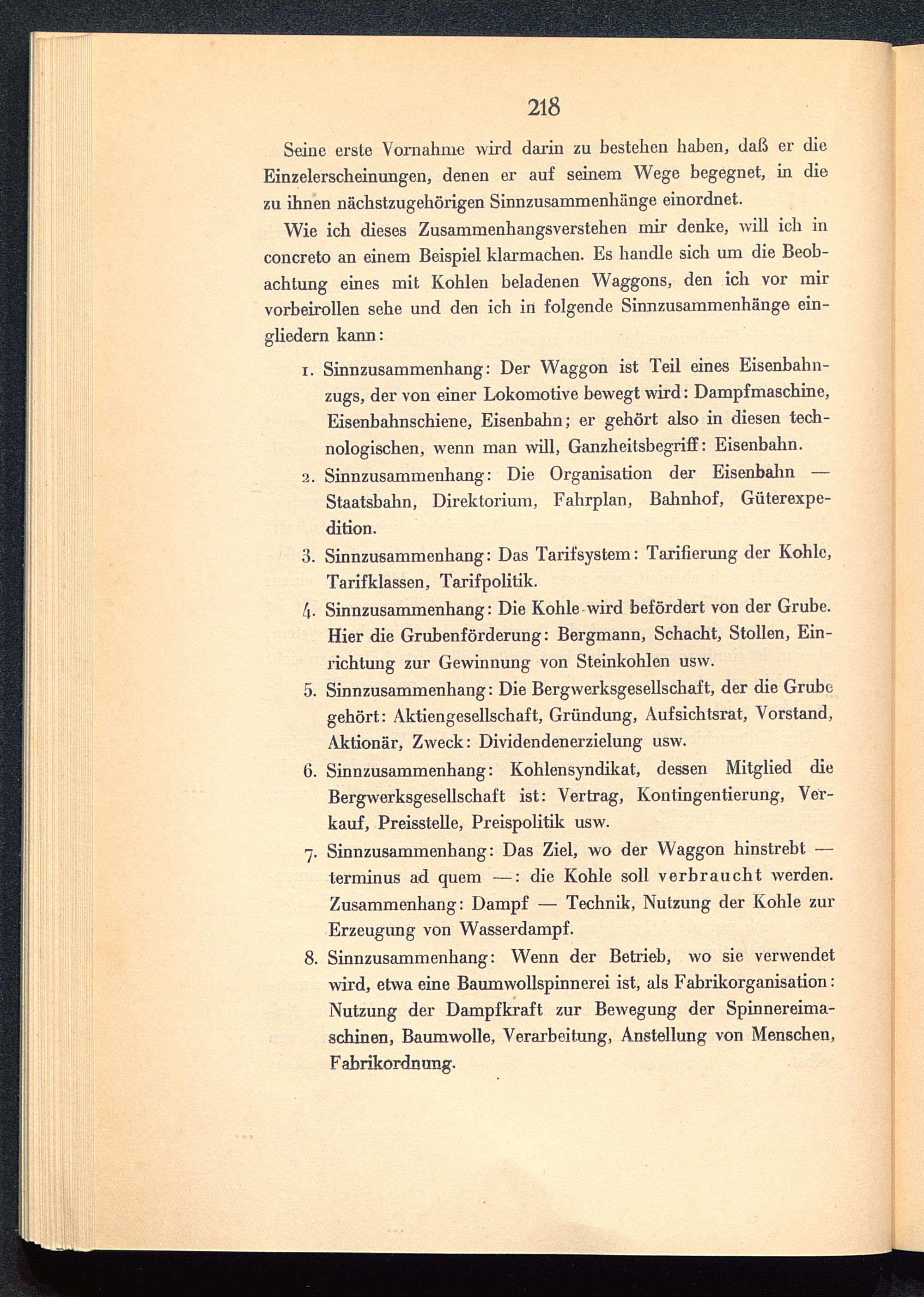 Wie ich dieses Zusammenhangsverstehen mir denke, will ich inconcreto an einem Beispiel klarmachen. Es handle sich um die Beob-achtung eines mit Kohlen beladenen Waggons, den ich vor mirvorbeirollen sehe und den ich in folgende Sinnzusammenhänge ein-gliedern kann: