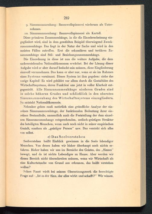 Die Einordnung in diese ist nun die weitere Aufgabe, die demsachverstehenden Nationalökonomen erwächst. Bei der Lösung dieserAufgabe wird er aber darauf bedacht sein müssen, diese Eingliederungsinnvoll vorzunehmen. Das kann er aber nur, wenn er sie im Rahmeneines Systems vornimmt. Dieses System ist ihm gegeben: siehe dasvorige Kapitel! Es wird gebildet vor allem durch die Gestaltidee desWirtschaftssystems, deren Funktion uns jetzt in voller Klarheit ent-gegentritt. Alle Sinnzusammenhänge niederen Grades sindin solche höheren Grades und schließlich in den oberstenSinnzusammenhang des Wirtschaftssystems einzugliedern.So entsteht Nationalökonomie.
