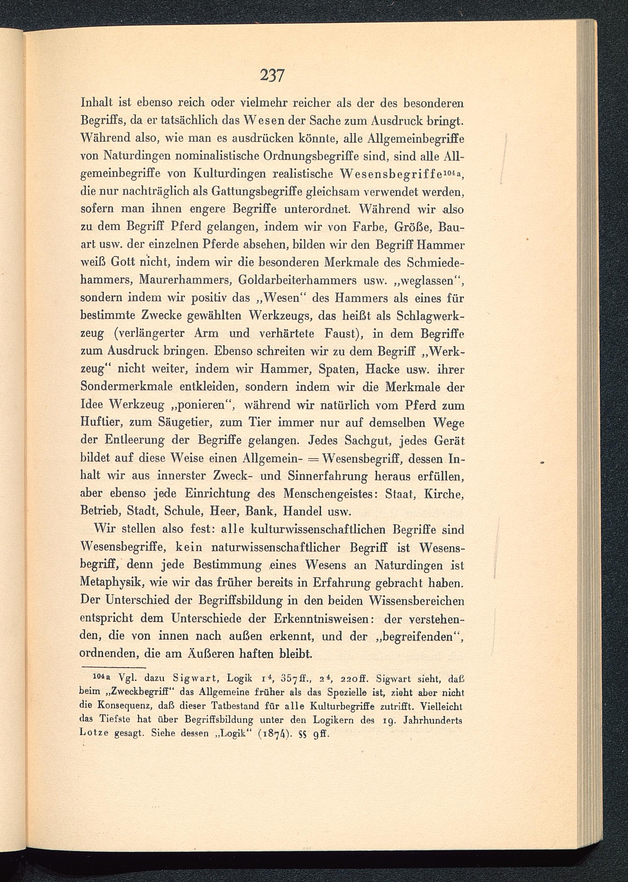 104 a Vgl. dazu Sigwart, Logik i 4 , 307 ff., 2 4 , 22off. Sigwart sieht, daßbeim „Zweckbegriff'‘ das Allgemeine früher als das Spezielle ist, zieht aber nichtdie Konsequenz, daß dieser Tatbestand für alle Kulturbegriffe zutrifft. Vielleichtdas Tiefste hat über Begriffsbildung unter den Logikern des 19. JahrhundertsLotze gesagt. Siehe dessen „Logik“ (1874). SS 9®-
