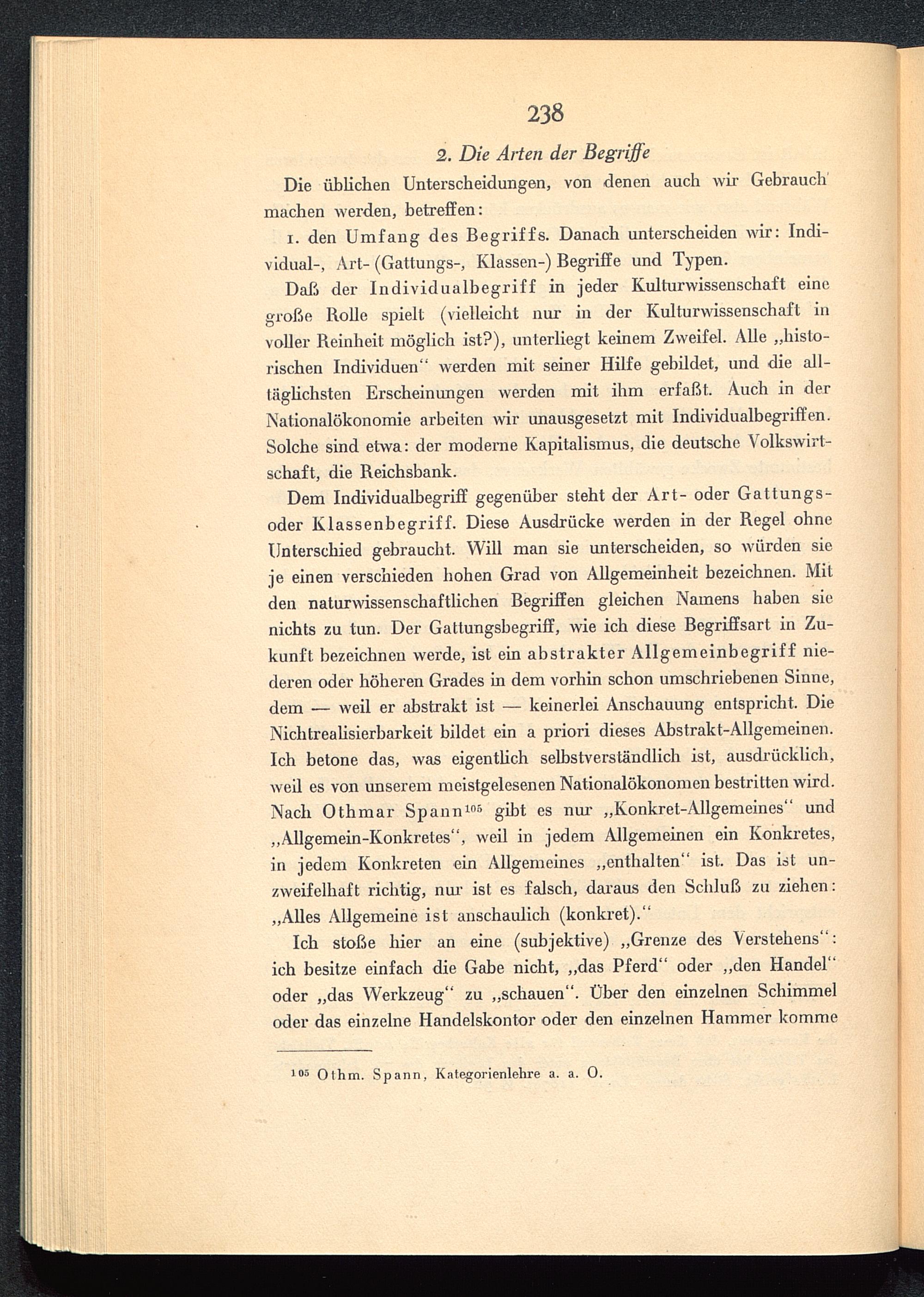 Dem Individualhegriff gegenüber steht der Art- oder Gattungs-oder Klassenbegriff. Diese Ausdrücke werden in der Regel ohneUnterschied gebraucht. Will man sie unterscheiden, so würden sieje einen verschieden hohen Grad von Allgemeinheit bezeichnen. Mitden naturwissenschaftlichen Begriffen gleichen Namens haben sienichts zu tun. Der Gattungsbegriff, wie ich diese Begriffsart in Zu-kunft bezeichnen werde, ist ein abstrakter Allgemeinbegriff nie-deren oder höheren Grades in dem vorhin schon umschriebenen Sinne,dem ■— weil er abstrakt ist — keinerlei Anschauung entspricht. DieNichtrealisierharkeit bildet ein a priori dieses Abstrakt-Allgemeinen.Ich betone das, was eigentlich selbstverständlich ist, ausdrücklich,weil es von unserem meistgelesenen Nationalökonomen bestritten wird.Nach Othmar Spann 105 gibt es nur „Konkret-Allgemeines“ und„Allgemein-Konkretes“, weil in jedem Allgemeinen ein Konkretes,in jedem Konkreten ein Allgemeines „enthalten“ ist. Das ist un-zweifelhaft richtig, nur ist es falsch, daraus den Schluß zu ziehen:„Alles Allgemeine ist anschaulich (konkret).“