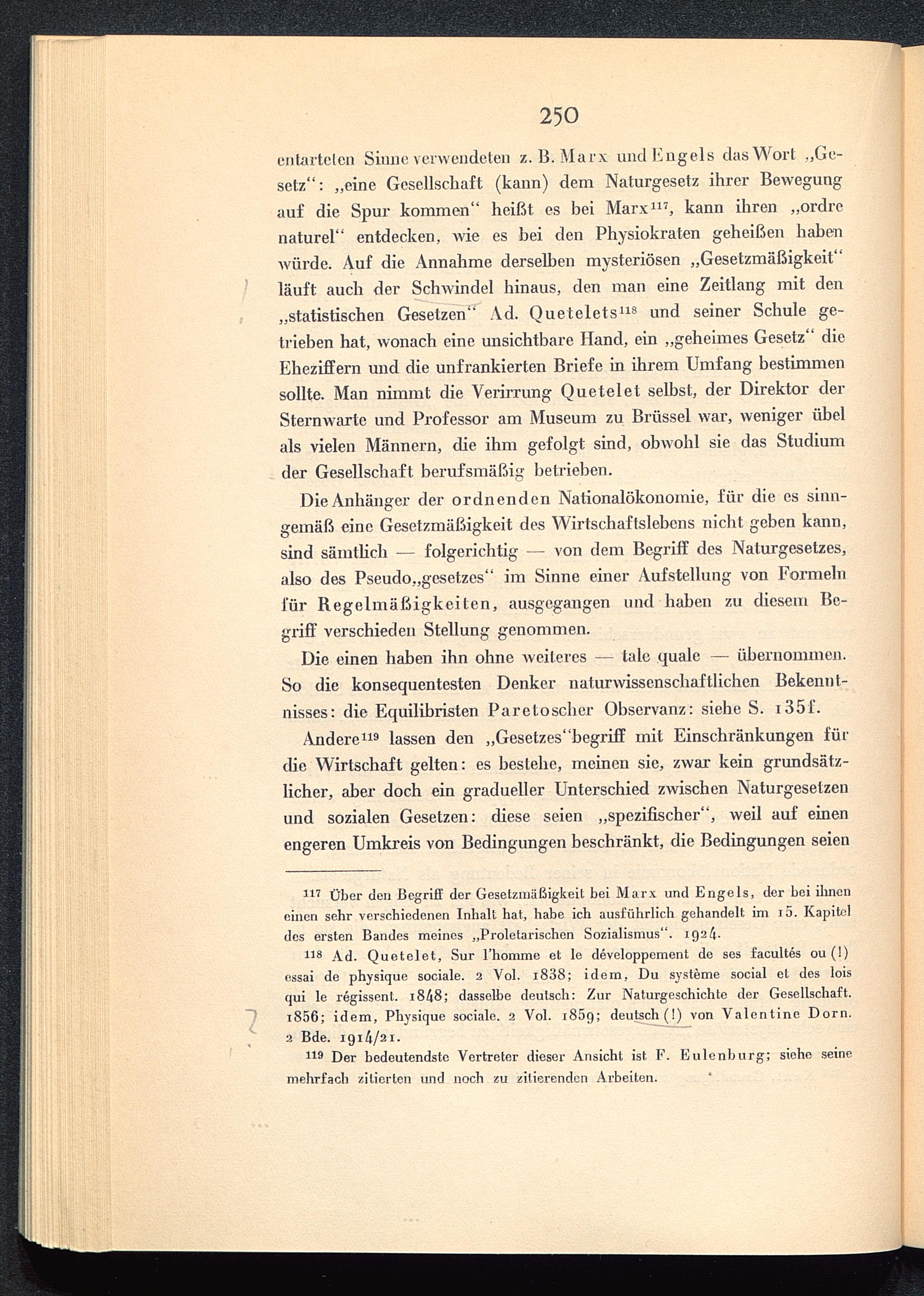 entarteten Siune verwendeten z. B. Marx und Engels das Wort ,,Ge-setz“ : „eine Gesellschaft (kann) dem Naturgesetz ihrer Bewegungauf die Spur kommen“ heißt es bei Marx 117 , kann ihren „ordrenaturel“ entdecken, wie es bei den Physiokraten geheißen habenwürde. Auf die Annahme derselben mysteriösen „Gesetzmäßigkeit“/ läuft auch der Schwindel hinaus, den man eine Zeitlang mit denr „statistischen Gesetzen' 7 Ad. Quetelets 118 und seiner Schule ge-trieben hat, wonach eine unsichtbare Hand, ein „geheimes Gesetz“ dieEheziffern und die unfrankierten Briefe in ihrem Umfang bestimmensollte. Man nimmt die Verirrung Quetelet selbst, der Direktor derSternwarte und Professor am Museum zu Brüssel war, weniger übelals vielen Männern, die ihm gefolgt sind, obwohl sie das Studiumder Gesellschaft berufsmäßig betrieben.