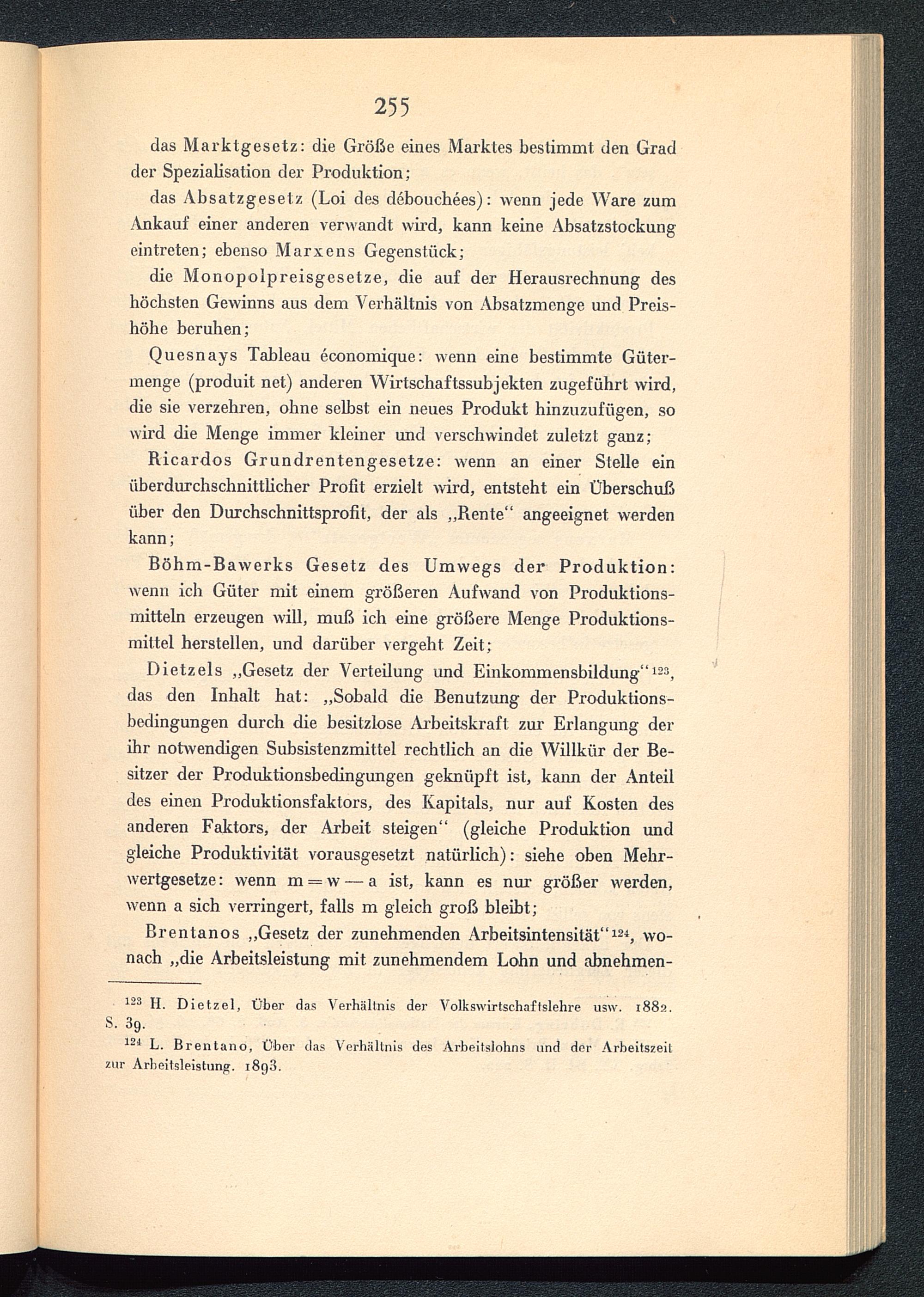 Dietzels „Gesetz der Verteilung und Einkommensbildung“ 123 ,das den Inhalt hat: „Sobald die Benutzung der Produktions-bedingungen durch die besitzlose /Arbeitskraft zur Erlangung derihr notwendigen Subsistenzmittel rechtlich an die Willkür der Be-sitzer der Produktionsbedingungen geknüpft ist, kann der Anteildes einen Produktionsfaklors, des Kapitals, nur auf Kosten desanderen Faktors, der Arbeit steigen“ (gleiche Produktion undgleiche Produktivität vorausgesetzt natürlich): siehe oben Mehr-wertgesetze: wenn m = w — a ist, kann es nur größer werden,wenn a sich verringert, falls m gleich groß bleibt;