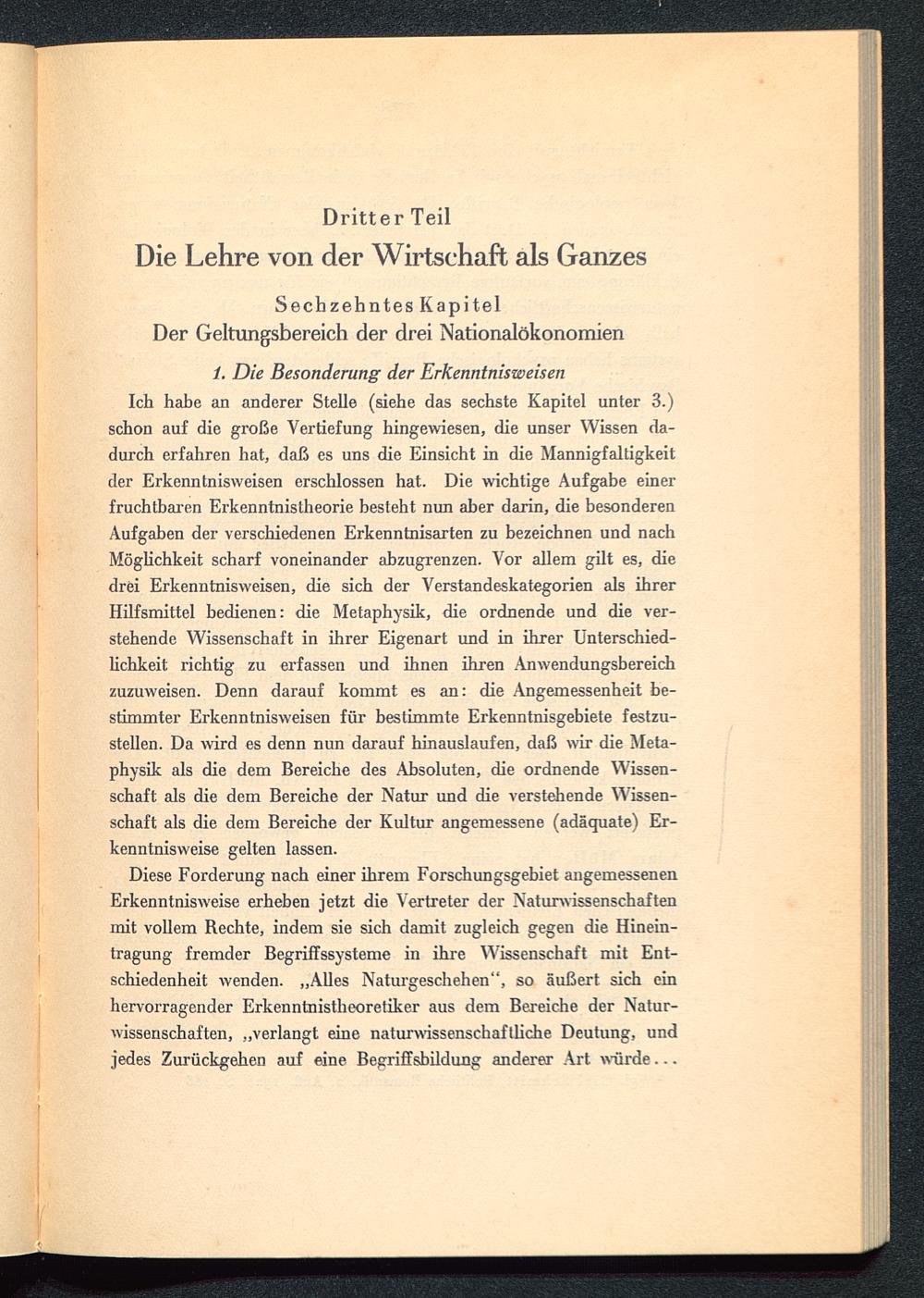1. Die Besonderung der ErkenntnisweisenIch habe an anderer Stelle (siehe das sechste Kapitel unter 3.)schon auf die große Vertiefung hingewiesen, die unser Wissen da-durch erfahren hat, daß es uns die Einsicht in die Mannigfaltigkeitder Erkenntnisweisen erschlossen hat. Die wichtige Aufgabe einerfruchtbaren Erkenntnistheorie besteht nun aber darin, die besonderenAufgaben der verschiedenen Erkenntnisarten zu bezeichnen und nachMöglichkeit scharf voneinander abzugrenzen. Vor allem gilt es, diedrei Erkenntnisweisen, die sich der Verstandeskategorien als ihrerHilfsmittel bedienen: die Metaphysik, die ordnende und die ver-stehende Wissenschaft in ihrer Eigenart und in ihrer Unterschied-lichkeit richtig zu erfassen und ihnen ihren Anwendungsbereichzuzuweisen. Denn darauf kommt es an: die Angemessenheit be-stimmter Erkenntnisweisen für bestimmte Erkenntnisgebiete festzu-stellen. Da wird es denn nun darauf hinauslaufen, daß wir die Meta-physik als die dem Bereiche des Absoluten, die ordnende Wissen-schaft als die dem Bereiche der Natur und die verstehende Wissen-schaft als die dem Bereiche der Kultur angemessene (adäquate) Er-kenntnisweise gelten lassen.