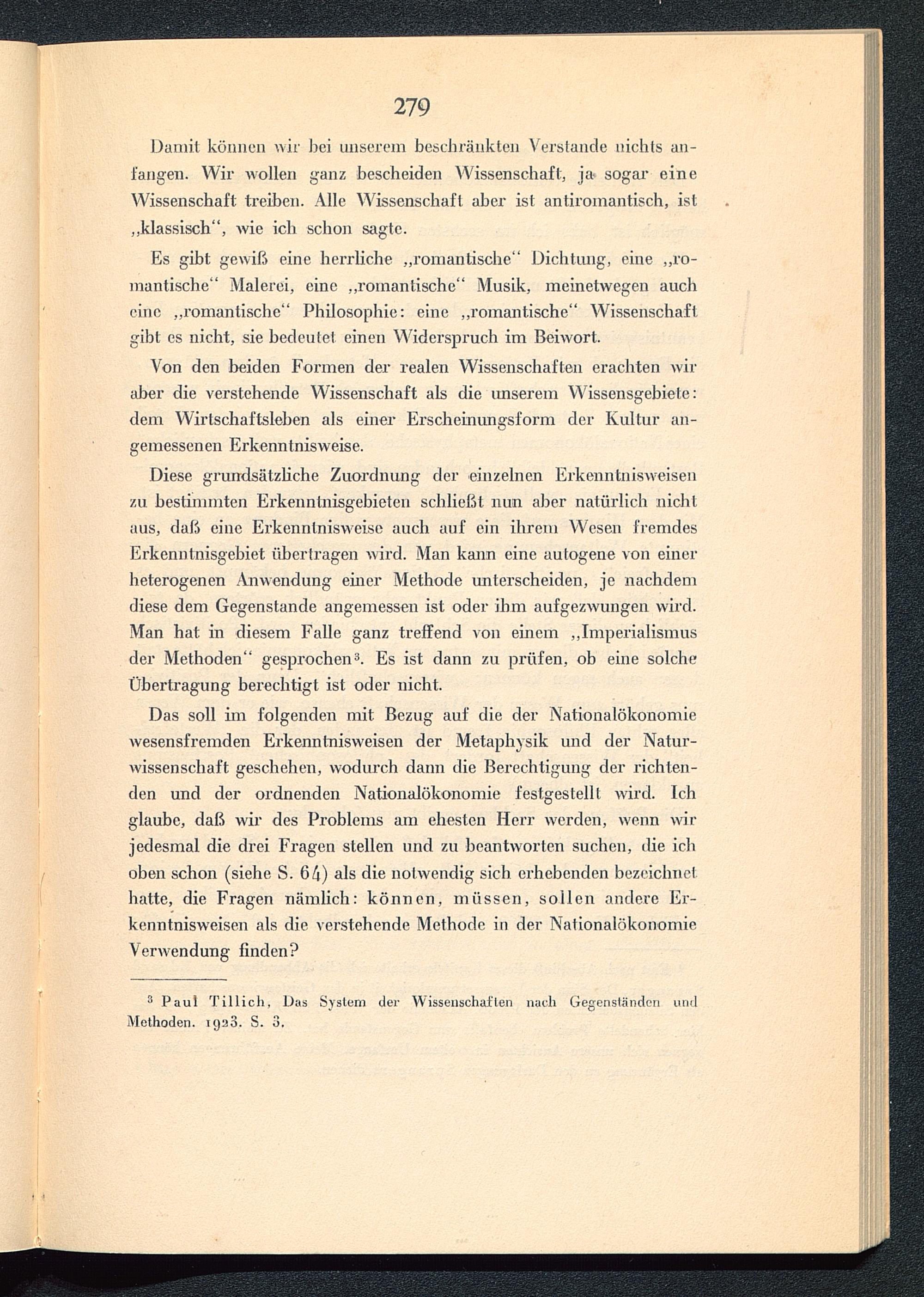 Das soll im folgenden mit Bezug auf die der Nationalökonomiewesensfremden Erkenntnisweisen der Metaphysik und der Natur-wissenschaft geschehen, wodurch dann die Berechtigung der richten-den und der ordnenden Nationalökonomie festgestellt wird. Ichglaube, daß wir des Problems am ehesten Herr werden, wenn wirjedesmal die drei Fragen stellen und zu beantworten suchen, die ichoben schon (siehe S. 64) als die notwendig sich erhebenden bezeichnethatte, die Fragen nämlich: können, müssen, sollen andere Er-kenn tnisw'eisen als die verstehende Methode in der NationalökonomieVerwendung finden?
