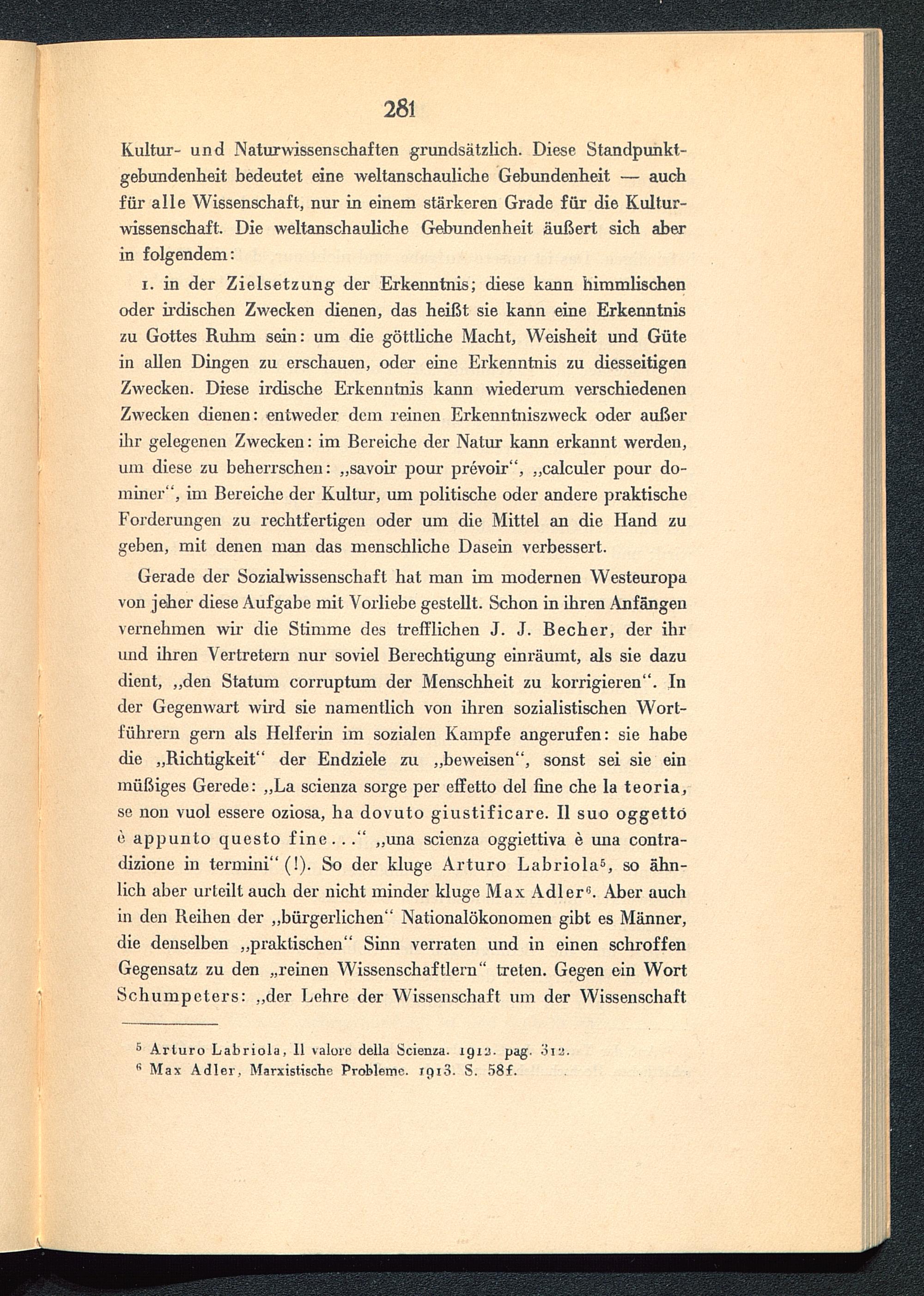 Gerade der Sozialwissenschaft hat man im modernen Westeuropa von jeher diese Aufgabe mit Vorliebe gestellt. Schon in ihren Anfängenvernehmen wir die Stimme des trefflichen J. J. Becher, der ihrund ihren Vertretern nur soviel Berechtigung einräumt, als sie dazudient, „den Statum corruptum der Menschheit zu korrigieren“. Inder Gegenwart wird sie namentlich von ihren sozialistischen Wort-führern gern als Helferin im sozialen Kampfe angerufen: sie habedie „Richtigkeit“ der Endziele zu „beweisen“, sonst sei sie einmüßiges Gerede: „La scienza sorge per effetto del fine che la teoria,se non vuol essere oziosa, ha dovuto giustificare. II suo oggettöe appunto questo fine. ..“ „una scienza oggiettiva e una contra-dizione in termini“(!). So der kluge Arturo Labriola 6 , so ähn-lich aber urteilt auch der nicht minder kluge Max Adler 6 . Aber auchin den Reihen der „bürgerlichen“ Nationalökonomen gibt es Männer,die denselben „praktischen“ Sinn verraten und in einen schroffenGegensatz zu den „reinen Wissenschaftlern“ treten. Gegen ein WortSchumpeters: „der Lehre der Wissenschaft um der Wissenschaft