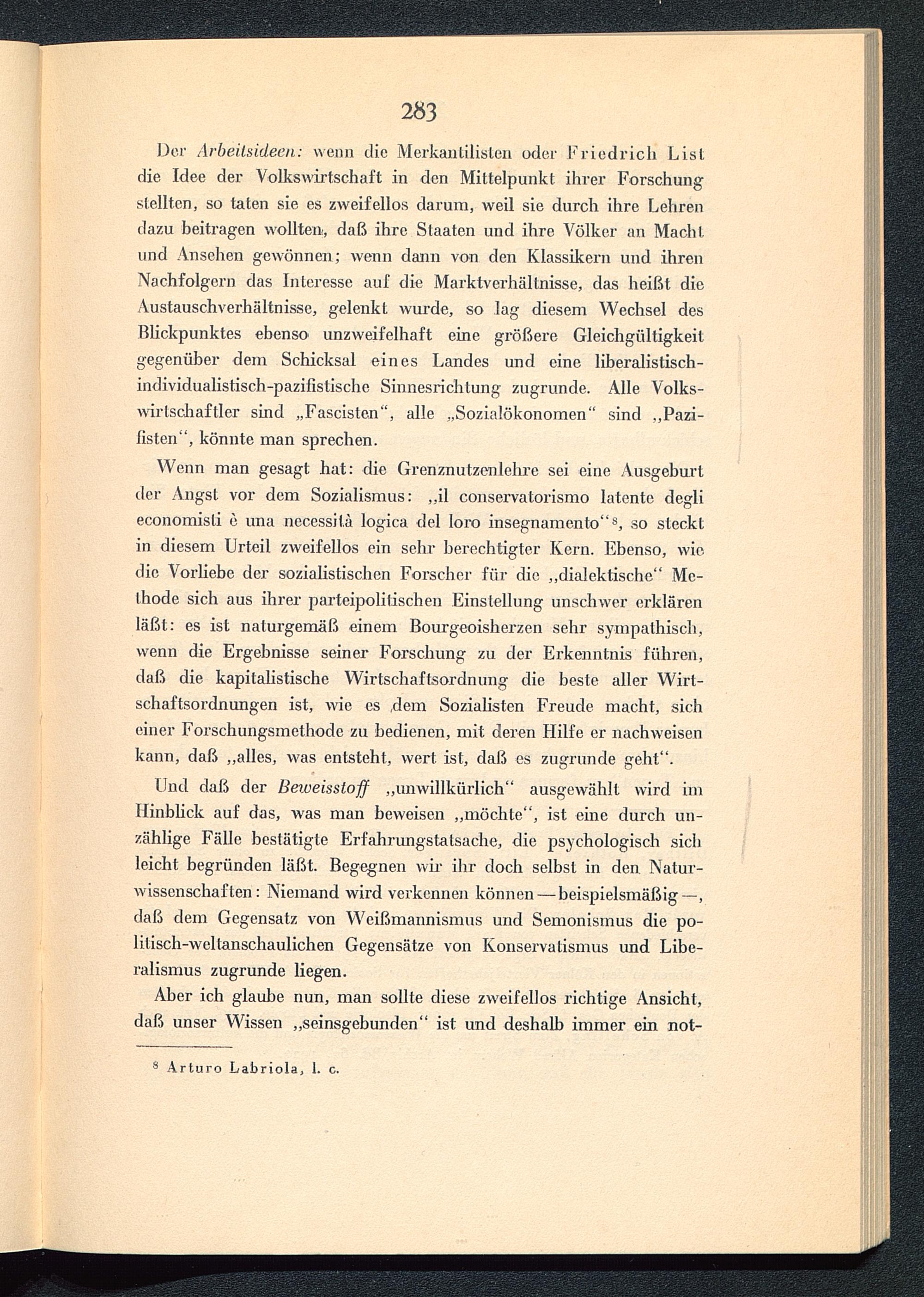 Wenn man gesagt hat: die Grenznutzenlehre sei eine Ausgeburtder Angst vor dem Sozialismus: „il conservatorismo latente deglieconomisli e una necessitä logica del loro insegnamento“ s , so stecktin diesem Urteil zweifellos ein sehr berechtigter Kern. Ebenso, wiedie Vorliebe der sozialistischen Forscher für die „dialektische“ Me-thode sich aus ihrer parteipolitischen Einstellung unschwer erklärenläßt: es ist naturgemäß einem Bourgeoisherzen sehr sympathisch,wenn die Ergebnisse seiner Forschung zu der Erkenntnis führen,daß die kapitalistische Wirtschaftsordnung die beste aller Wirt-schaftsordnungen ist, wie es dem Sozialisten Freude macht, sicheiner Forschungsmethode zu bedienen, mit deren Hilfe er nachweisenkann, daß „alles, was entsteht, wert ist, daß es zugrunde geht“.