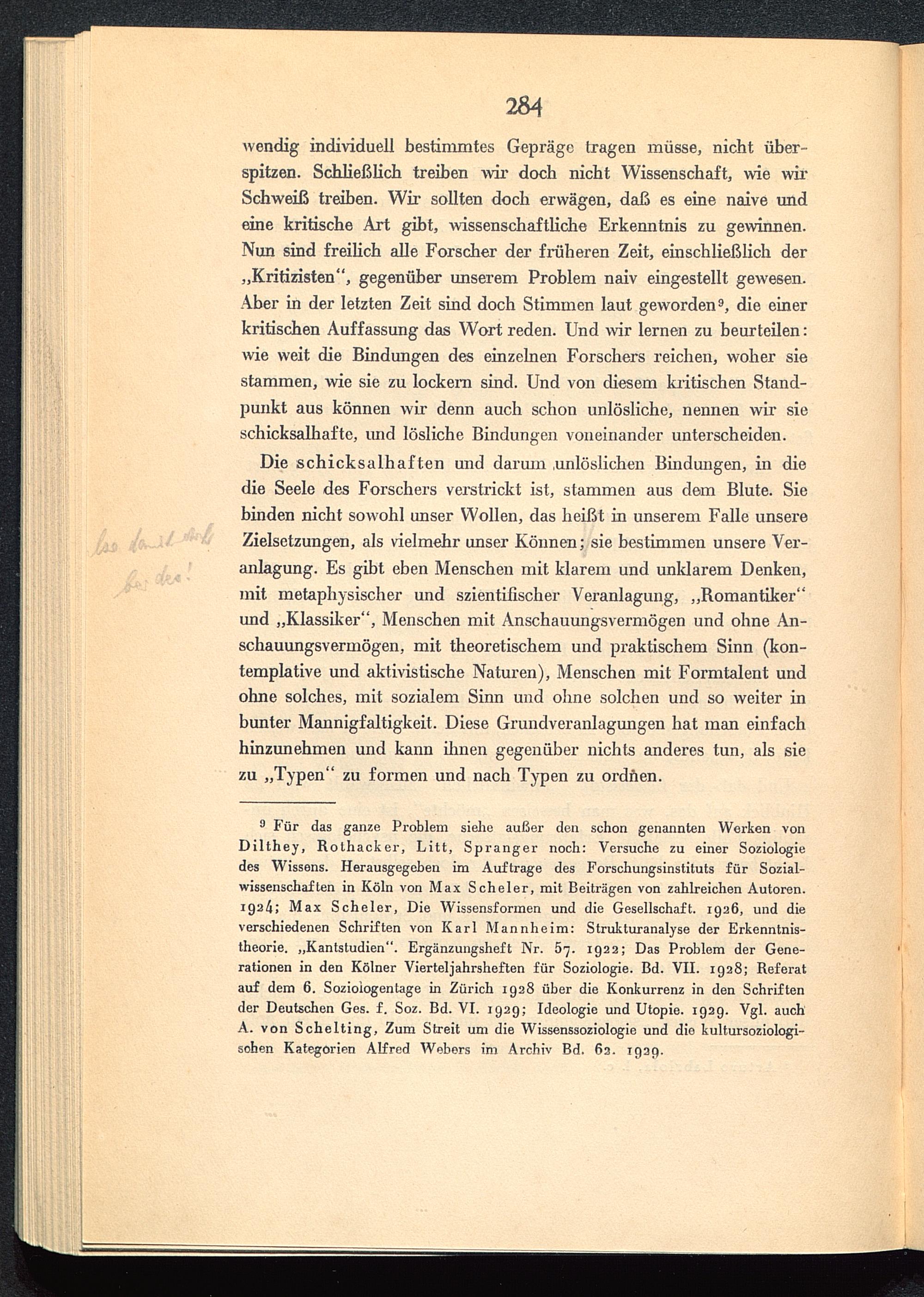 9 Für das ganze Problem siehe außer den schon genannten Werken vonDilthey, Rothacker, Litt, Spranger noch: Versuche zu einer Soziologiedes Wissens. Herausgegeben im Aufträge des Forschungsinstituts für Sozial-wissenschaften in Köln von Max Scheler, mit Beiträgen von zahlreichen Autoren.1924; Max Scheler, Die Wissensformen und die Gesellschaft. 1926, und dieverschiedenen Schriften von Karl Mannheim: Strukturanalyse der Erkenntnis-theorie. „Kantstudien“. Ergänzungsheft Nr. 57. 1922; Das Problem der Gene-rationen in den Kölner Vierteljahrsheften für Soziologie. Bd. VII. 1928; Referatauf dem 6. Sozioiogentage in Zürich 1928 über die Konkurrenz in den Schriftender Deutschen Ges. f. Soz. Bd. VI. 1929; Ideologie und Utopie. 1929. Vgl. auchA. von Schelting, Zum Streit um die Wissenssoziologie und die kultursoziologi-sohen Kategorien Alfred Webers im Archiv Bd. 62. 1929.
