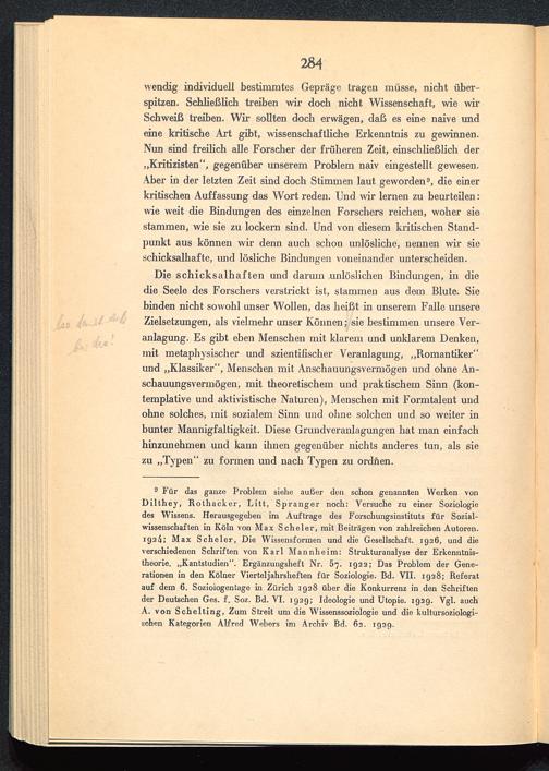 Die schicksalhaften und darum .unlöslichen Bindungen, in diedie Seele des Forschers verstrickt ist, stammen aus dem Blute. Siebinden nicht sowohl unser Wollen, das heißt in unserem Falle unsereZielsetzungen, als vielmehr unser Können; sie bestimmen unsere Ver-anlagung. Es gibt eben Menschen mit klarem und unklarem Denken,mit metaphysischer und szientifrscher Veranlagung, „Romantiker“und „Klassiker“, Menschen mit Anschauungsvermögen und ohne An-schauungsvermögen, mit theoretischem und praktischem Sinn (kon-templative und aktivistische Naturen), Menschen mit Formtalent undohne solches, mit sozialem Sinn und ohne solchen und so weiter inbunter Mannigfaltigkeit. Diese Grundveranlagungen hat man einfachhinzunehmen und kann ihnen gegenüber nichts anderes tun, als siezu „Typen“ zu formen und nach Typen zu ordften.