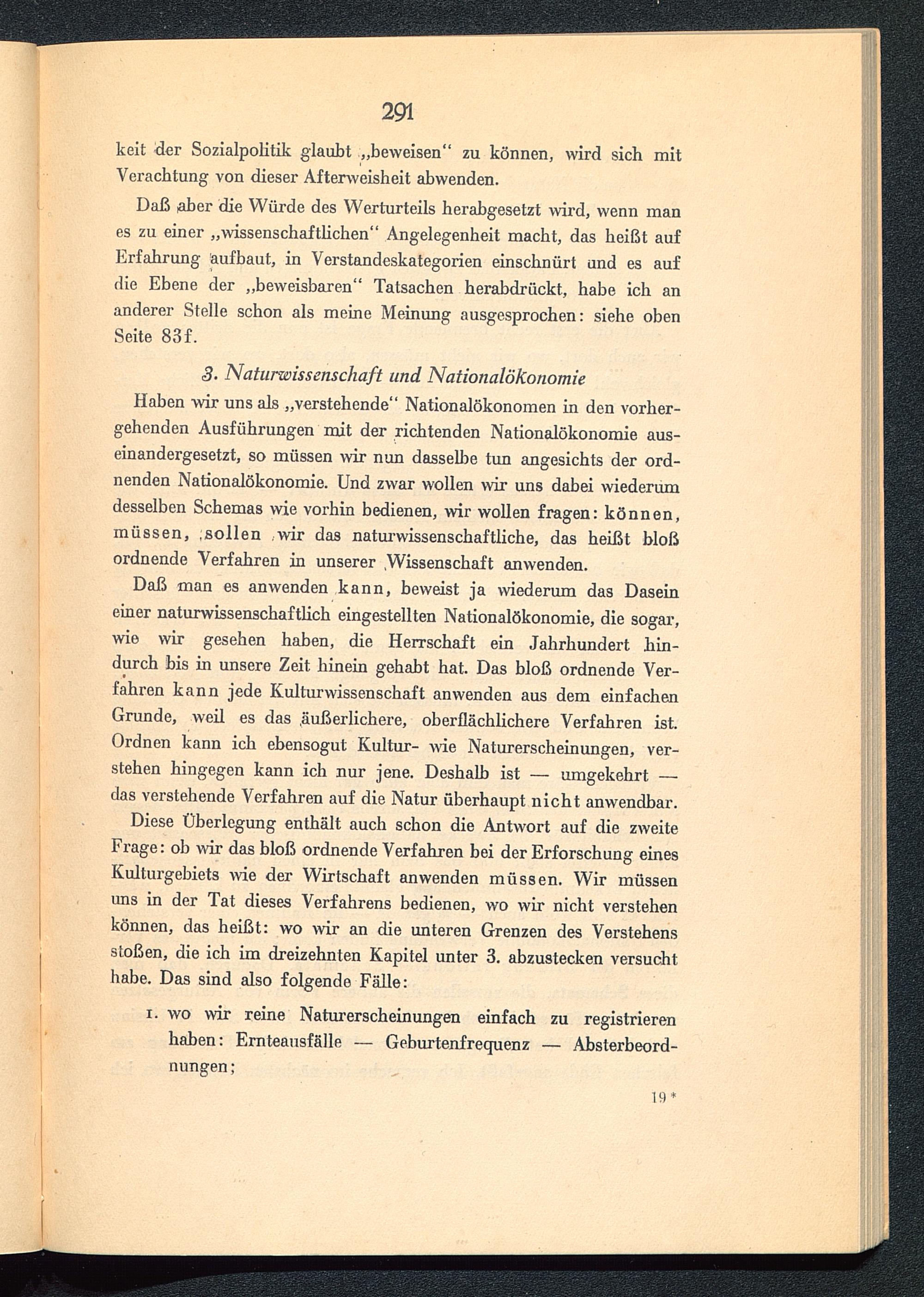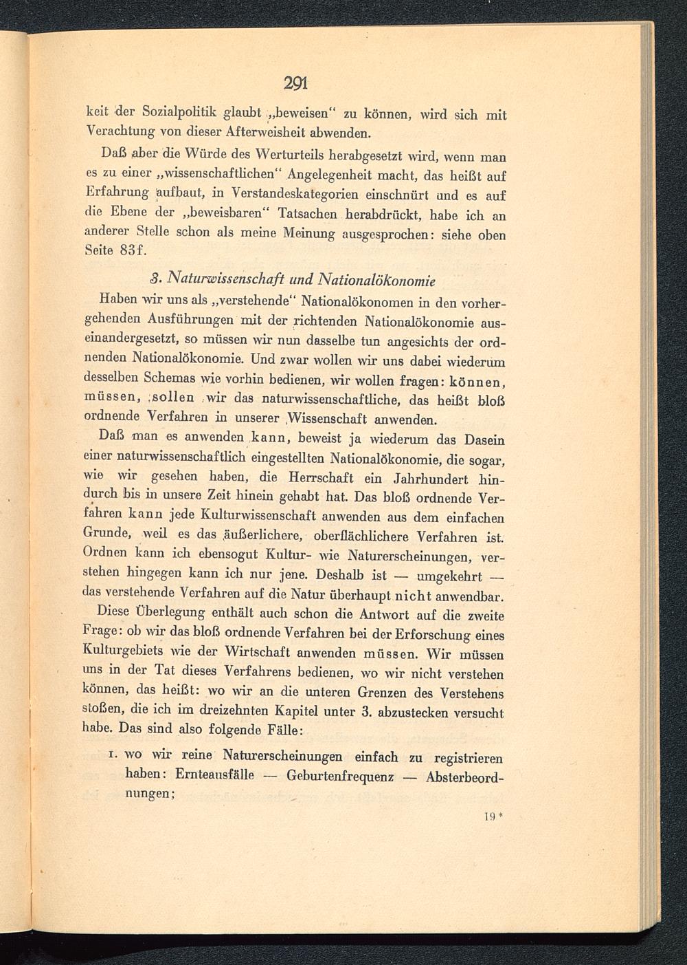 3- Naturwissenschaft und NationalökonomieHaben wir uns als „verstehende“ Nationalökonomen in den vorher-gehenden Ausführungen mit der richtenden Nationalökonomie aus-einandergesetzt, so müssen wir nun dasselbe tun angesichts der ord-nenden Nationalökonomie. Und zwar wollen wir uns dabei wiederumdesselben Schemas wie vorhin bedienen, wir wollen fragen: können,müssen, ;sollen wir das naturwissenschaftliche, das heißt bloßordnende Verfahren in unserer Wissenschaft anwenden.