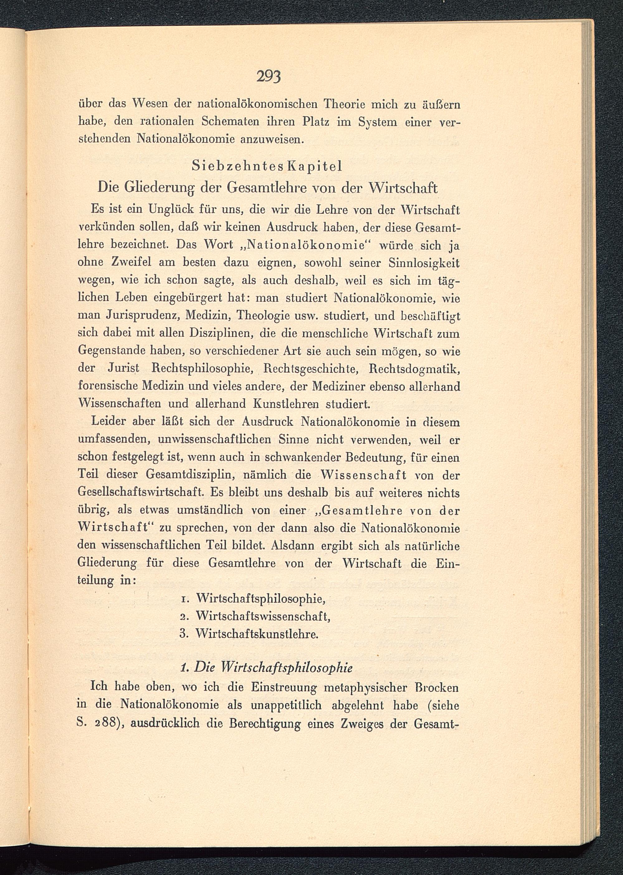 Ich habe oben, wo ich die Einstreuung metaphysischer Brockenin die Nationalökonomie als unappetitlich abgelehnt habe (sieheS. 288), ausdrücklich die Berechtigung eines Zweiges der Gesamt-