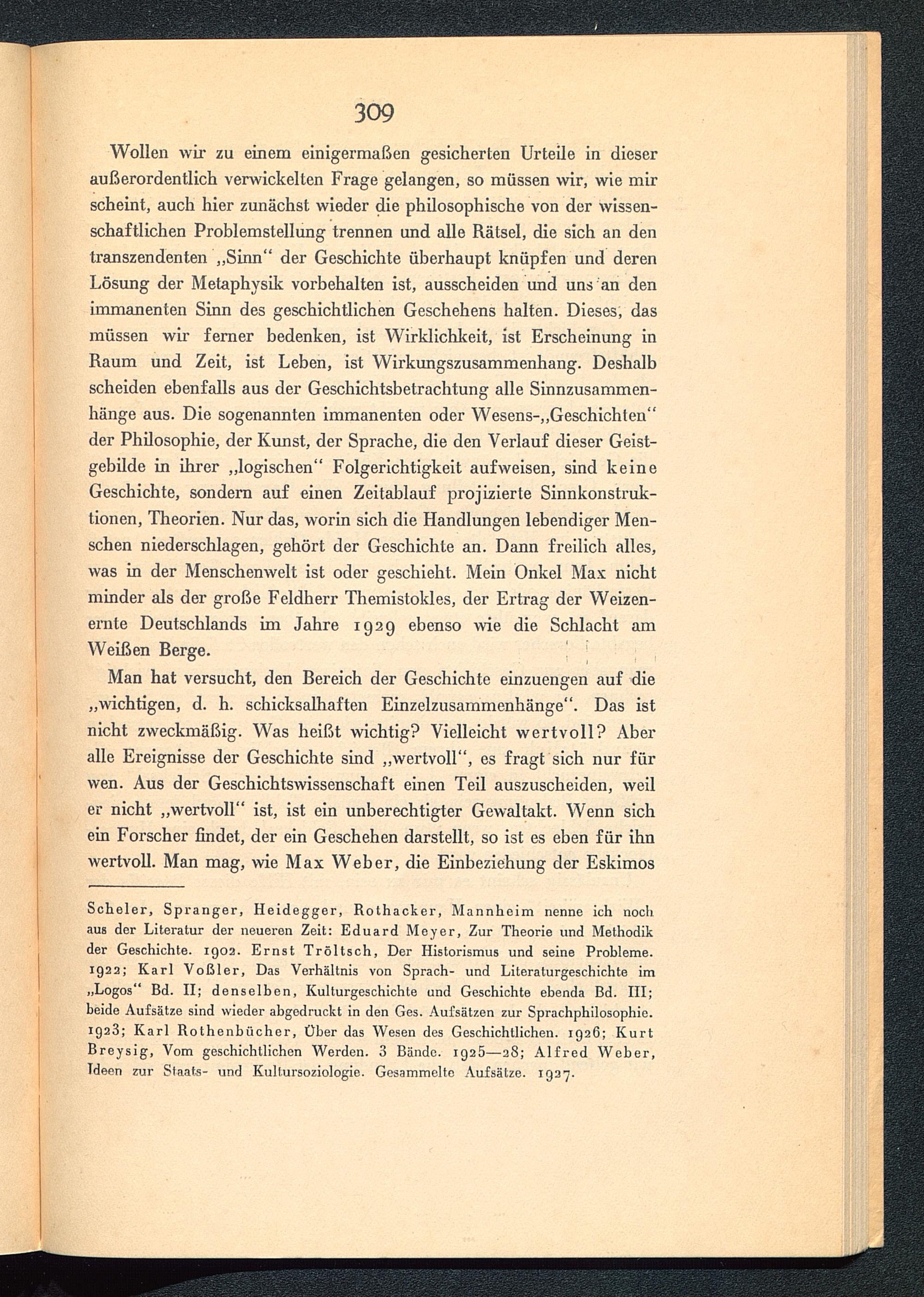 Scheler, Spranger, Heidegger, Rothacker, Mannheim nenne ich nochaus der Literatur der neueren Zeit: Eduard Meyer , Zur Theorie und Methodikder Geschichte. 1902. Ernst Tröltsch , Der Historismus und seine Probleme.1922; Karl Voßler , Das Verhältnis von Sprach- und Literaturgeschichte im„Logos“ Bd. II; denselben, Kulturgeschichte und Geschichte ebenda Bd. III;beide Aufsätze sind wieder abgodruckt in den Ges. Aufsätzen zur Sprachphilosophie.1923; Karl Rothenbücher, Über das Wesen des Geschichtlichen. 1926; KurtBreysig, Vom geschichtlichen Werden. 3 Bände. 1925—28; Alfred Weber, Ideen zur Staats- und Kultursoziologie. Gesammelte Aufsätze. 1927.
