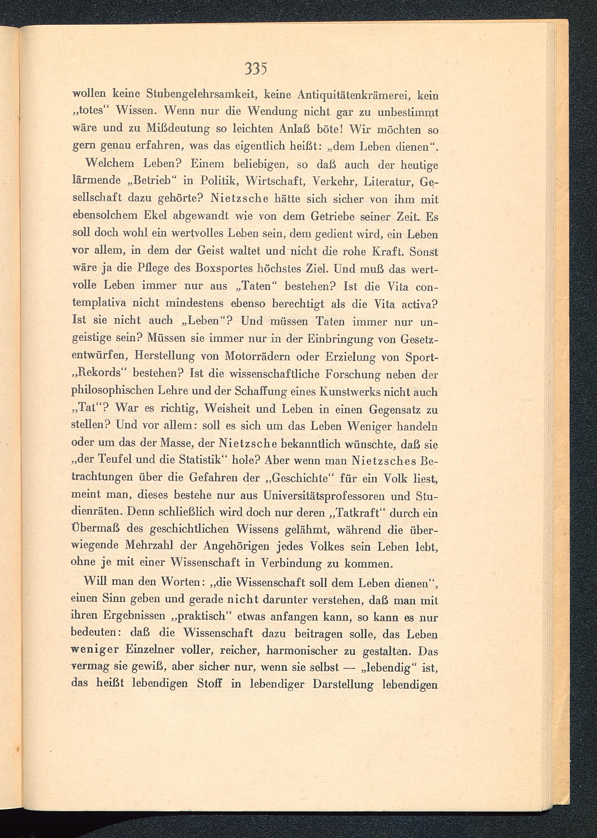 wollen keine Stubengelehrsamkeit, keine Antiquitätenkrämerei, kein„totes“ Wissen. Wenn nur die Wendung nicht gar zu unbestimmtwäre und zu Mißdeutung so leichten Anlaß böte! Wir möchten sogern genau erfahren, was das eigentlich heißt: „dem Leben dienen“.