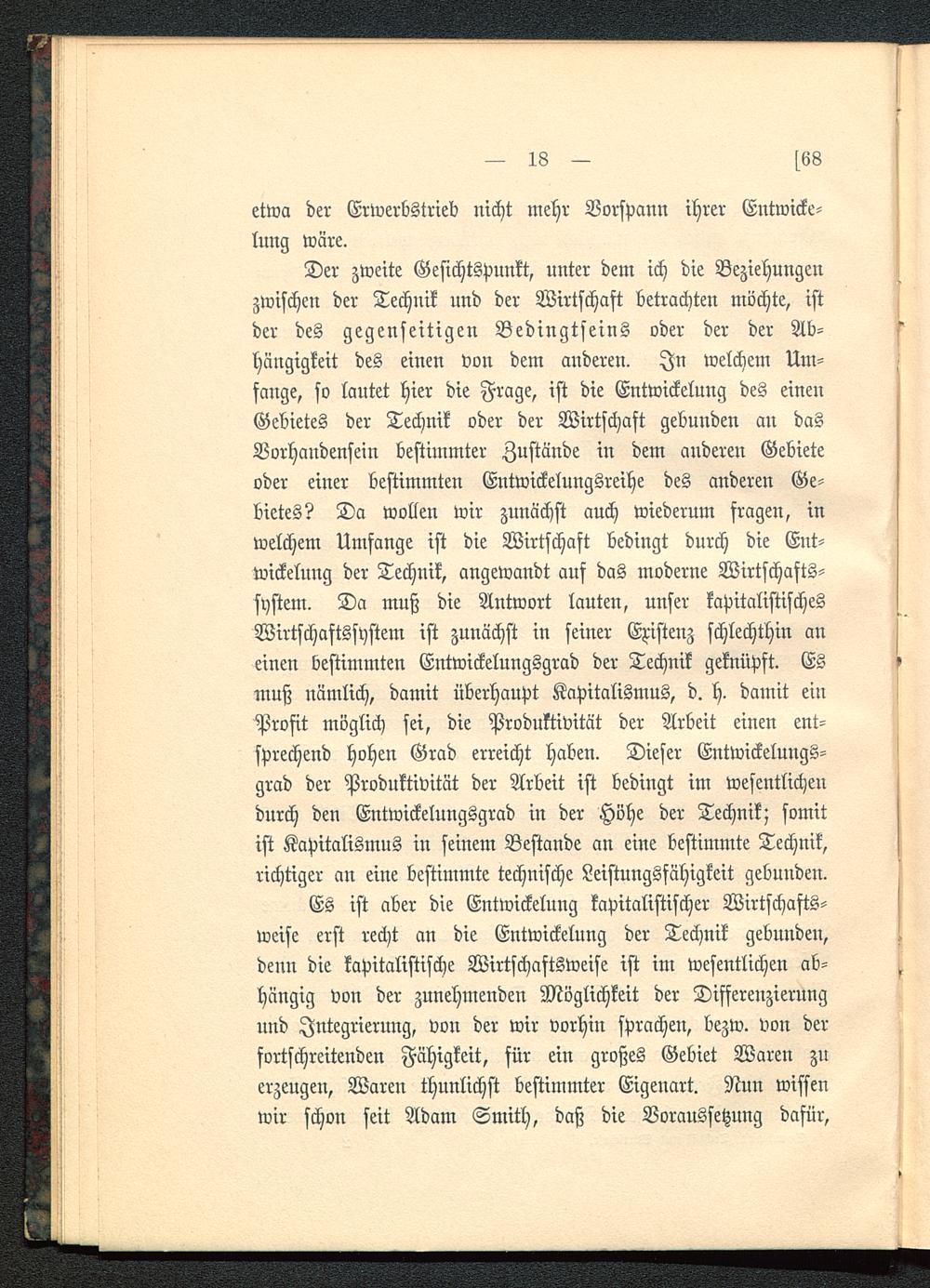 Es ist aber die Entwickelung kapitalistischer Wirtschafts-weise erst recht an die Entwickelung der Technik gebunden,denn die kapitalistische Wirtschaftsweise ist im wesentlichen ab-hängig von der zunehmenden Möglichkeit der Differenzierungund Jntegrierung, von der wir vorhin sprachen, bezw. von derfortschreitenden Fähigkeit, für ein großes Gebiet Waren zuerzeugen, Waren thunlichst bestimmter Eigenart. Nun wissenwir schon seit Adam Smith , daß die Voraussetzung dafür,