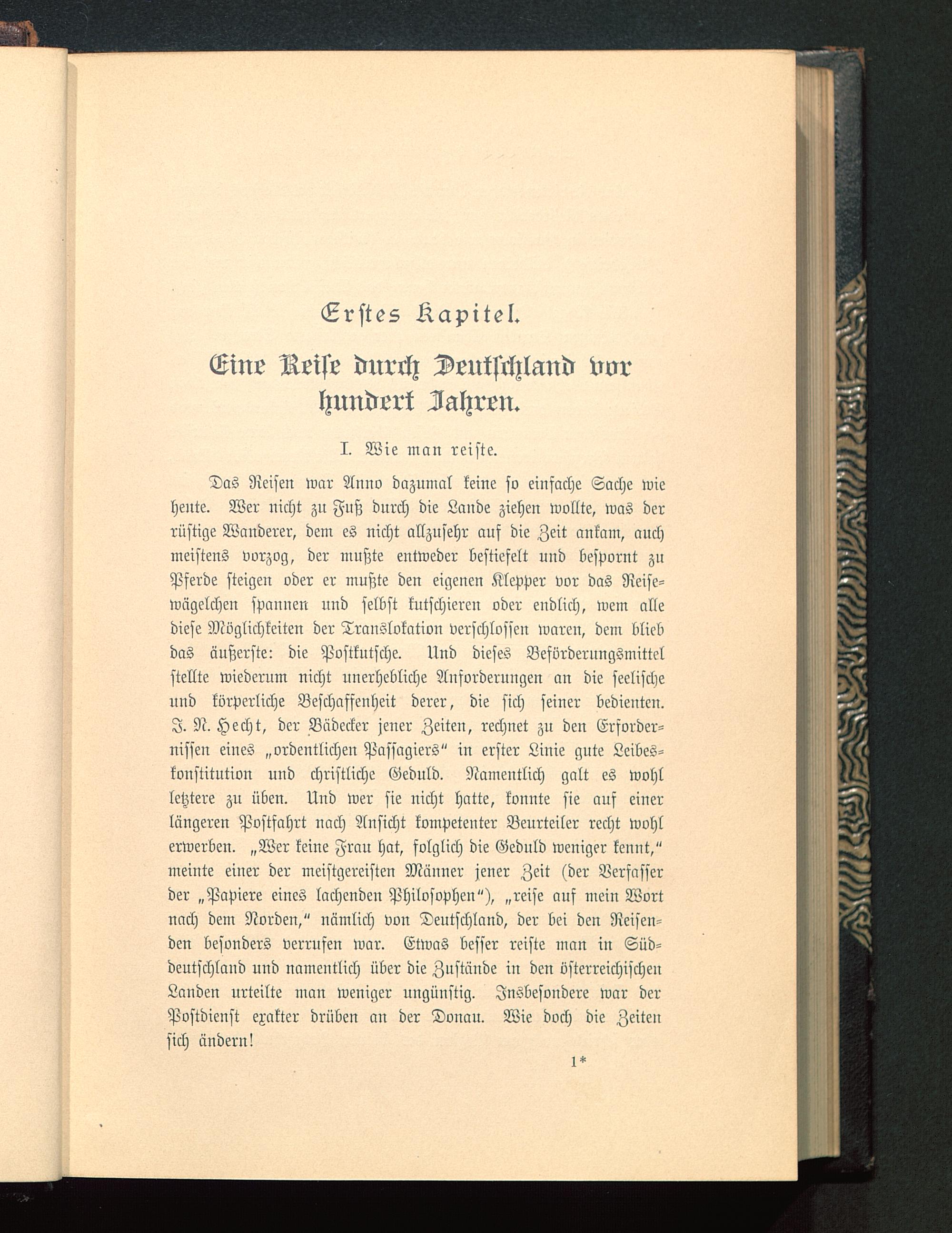 Das Reisen war Anno dazumal keine so einfache Sache wiehente. Wer nicht zn Fuß durch die Lande ziehen wollte, was derrüstige Wanderer, dem es nicht allzusehr auf die Zeit ankam, auchmeistens vorzog, der mußte entweder bestiefelt und bespornt zuPferde steigen oder er mußte den eigenen Klepper vor das Reise-wägelchen spannen uud selbst kutschieren oder endlich, wem allediese Möglichkeiten der Translokation verschlossen waren, dem bliebdas äußerste: die Postkutsche. Und dieses Beförderungsmittelstellte wiederum nicht unerhebliche Anforderungen an die seelischeuud körperliche Beschaffenheit derer, die sich seiner bedienten.I. N.Hecht, der Bädecker jener Zeiten, rechnet zu den Erforder-nissen eines „ordentlichen Passagiers" in erster Linie gute Leibes-koustitution und christliche Gednld. Namentlich galt es Wohlletztere zu üben. Und wer sie nicht hatte, konnte sie auf eiuerlängeren Postfahrt nach Ansicht kompetenter Beurteiler recht Wohlerwerben. „Wer keine Frau hat, folglich die Gednld weniger kennt,"meinte einer der meistgereisten Männer jener Zeit (der Verfasserder „Papiere eines lachenden Philosophen"), „reise auf mein Wortnach dem Norden," nämlich von Deutschland , der bei den Reisen-den besonders verrufen war. Etwas besser reiste man in Süd-deutschlaud und namentlich über die Zustände in den österreichischenLanden urteilte man weniger ungünstig. Insbesondere war derPostdicnst exakter drüben an der Donau . Wie doch die Zeitensich ändern!