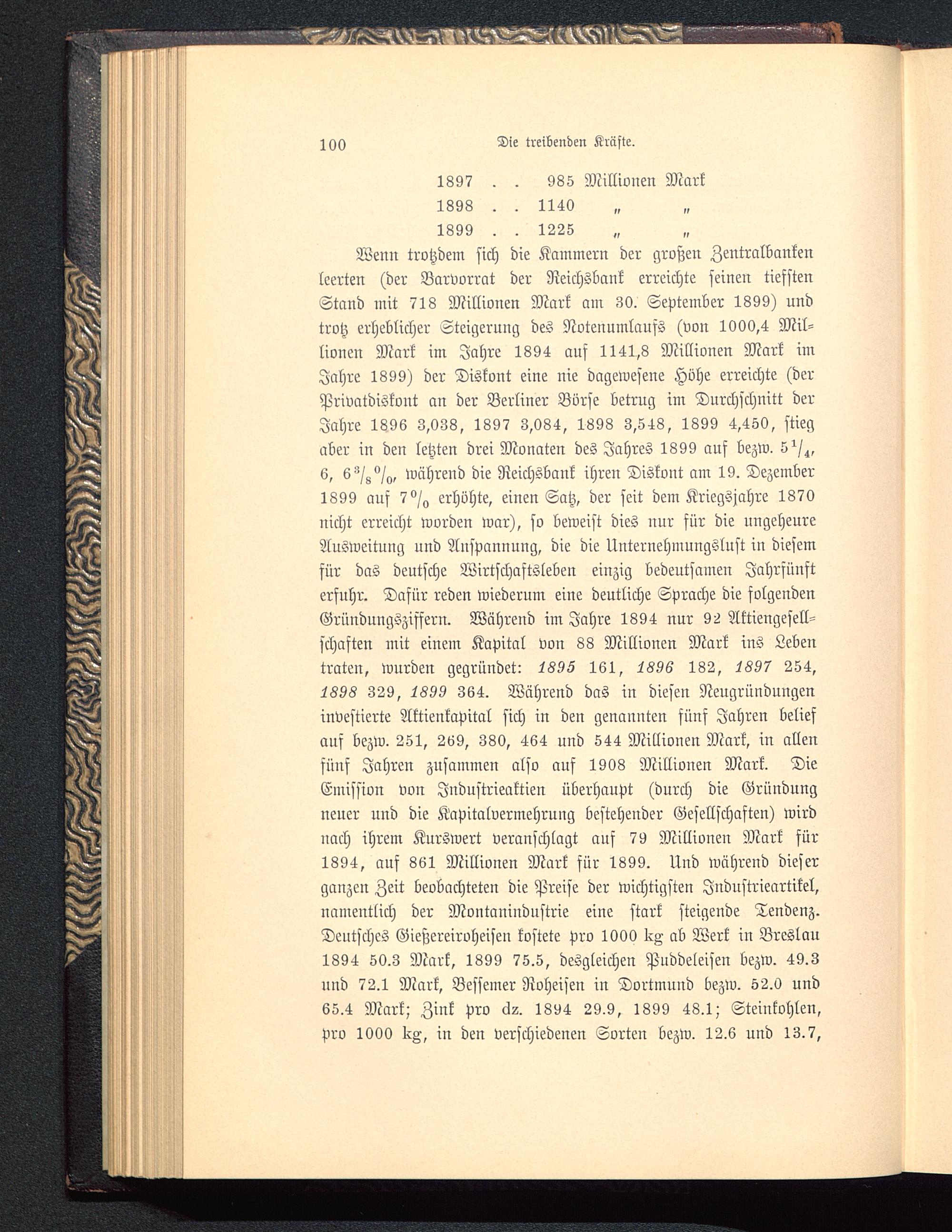 Wenn trotzdem sich die Kammern der großen Zentralbankenleerten (der Barvorrat der Reichsbank erreichte seinen tiefstenStand mit 718 Millionen Mark am 30. September 1899) undtrotz erheblicher Steigerung des Notenumlaufs (von 1000,4 Mil-lionen Mark im Jahre 1894 auf 1141,8 Millionen Mark imJahre 1899) der Diskont eine nie dagewesene Hohe erreichte (derPrivatdiskont an der Berliner Börse betrug im Durchschnitt derJahre 1896 3,038, 1897 3,084, 1898 3,548, 1899 4,450, stiegaber in den letzten drei Monaten des Jahres 1899 auf bezw. 5^,6, 6"/g°/g, während die Reichsbank ihren Diskont am 19. Dezember1899 auf 7°/g erhöhte, einen Satz, der seit dem Kriegsjahre 1870nicht erreicht worden war), so beweist dies nur für die ungeheureAusweitung und Anspannung, die die Unternehmungslust in diesemfür das deutsche Wirtschaftsleben einzig bedeutsamen Jahrfünfterfuhr. Dafür reden wiederum eine deutliche Sprache die folgendenGründungsziffern. Während im Jahre 1894 nur 9^ Aktiengesell-schaften mit einem Kapital von 88 Millionen Mark ins Lebentraten, wurden gegründet: 4S9S 161, ^6S6 182, ^SS7 254,^SSS 329, ^SSS 364. Während das in diesen Neugründungeninvestierte Aktienkapital sich in den genannten fünf Jahren beliefauf bezw. 251, 269, 380, 464 und 544 Millionen Mark, in allenfünf Jahren zusammen also auf 1908 Millionen Mark. DieEmission von Jndustrieaktien überhaupt (durch die Gründungneuer und die Kapitalvermehrung bestehender Gesellschaften) wirdnach ihrem Kurswert veranschlagt ans 79 Millionen Mark für1894, auf 861 Millionen Mark für 1899. Und während dieserganzen Zeit beobachteten die Preise der wichtigsten Jndustrieartikel,namentlich der Montanindustrie eine stark steigende Tendenz.Deutsches Gießereiroheisen kostete pro 1000 1^ ab Werk in Breslau 1894 50.3 Mark, 1899 75.5, desgleichen Puddeleisen bezw. 49.3und 72.1 Mark, Bessemer Roheisen in Dortmund bezw. S2.0 und65.4 Mark; Zink Pro 62. 1894 29.9, 1899 48.1; Steinkohlen,pro 1000 IvA, in den verschiedenen Sorten bezw. 12.6 und 13.7,