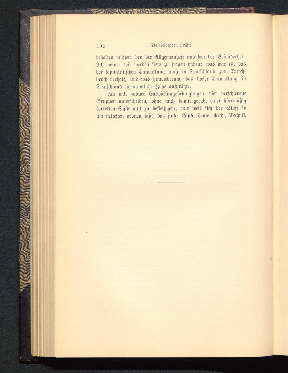 Ich will solcher Entwicklungsbedingungen vier verschiedeneGruppen unterscheide», vhue mich damit gerade einer übermäßigkorrekten Systematik zu befleißigen; nur weil sich der Stoff soam nettesten ordnen läßt; das sind: Land, Leute, Recht, Technik.
