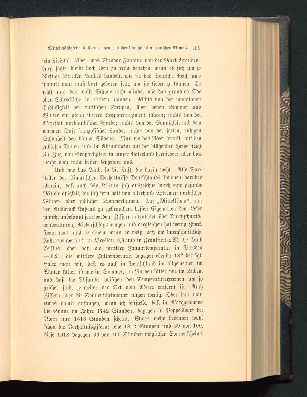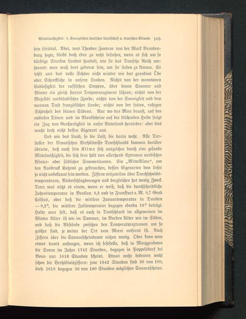 Und wie das Land, so die Luft, die darin weht. Alle Dar-steller der klimatischen Verhältnisse- Deutschlands kommen darüberüberein, daß auch sein Klima sich auszeichne durch eine gesundeMittelmäßigkeit, die sich fern hält vou allerhand Extremen nordischerWinter- oder südlicher Sommerlauneu. Ein „Mittelklima", umden Ausdruck Kutzens zu gebrauchen, dessen Eigenarten dem Leserja nicht unbekannt sein werden. Ziffern mitzuteilen über Durchschnitts-teinperaturen, Niederschlagsmengen und dergleichen hat wenig Zweck.Denn was nützt es einem, wenn er weiß, daß die durchschuittlicheJahrestemperatur in Breslau 8,3 und in Frankfurt a. M. 9,7 GradCelsius, oder daß die mittlere Januartemperatur in Dresden — 0,2", die mittlere Julitemperatur dagegen ebenda 18" beträgt.Halte man fest, daß es auch iu Deutschland im allgemeinen imWinter kälter ist wie im Sommer, im Norden kälter wie im Süden,und daß die Abstände zwischen den Temperaturextremen um sogrößer sind, je weiter der Ort vom Meere entfernt ist. AuchZiffern über die Sonnenscheindauer nützen wenig. Oder kann manetwas damit anfange!,, wenn ich feststelle, daß in Marggrabowa die Sonne im Jahre 1742 Stunden, dagegen in PoPPelsdorf beiBonn mir 1613 Stunden scheint. Etwas mehr bedeuten wohlschon die Verhältnisziffern: jene 1842 Stunden sind 39 von 100,diese 1618 dagegen 36 von 100 Stunden möglichen Sonnenscheins.