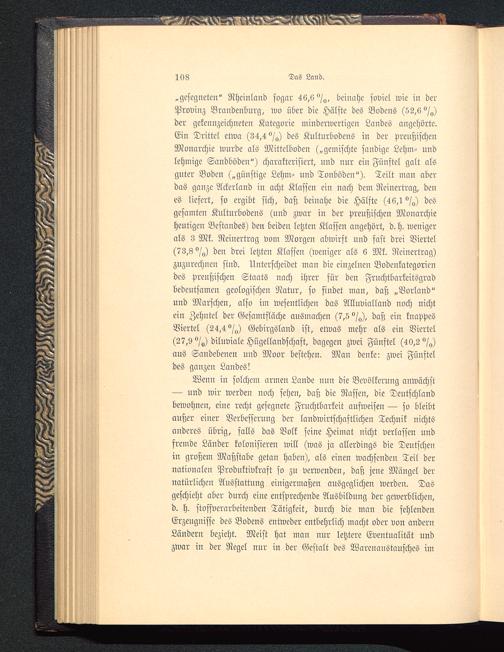 „gesegneten" Rheinland sogar 46,6 beinahe soviel wie in derProvinz Brandenburg , wo über die Hälfte des Bodens (52,6 <>/<,)der gekennzeichneten Kategorie minderwertigen Landes angehörte.Ein Drittel etwa (34,4 °/„) des Kulturbodens in der Preußischen Monarchie wurde als Mittelboden („gemischte sandige Lehm- undlehmige Sandboden") charakterisiert, nnd nur ein Fünftel galt alsguter Boden („günstige Lehm- uud Tonböden"). Teilt man aberdas ganze Ackerland in acht Klassen ein nach dem Reinertrag, denes liefert, so ergibt sich, daß beinahe die Hälfte (46,1 <>/g) desgesamten Kulturbodens (uud zwar in der preußischen Monarchieheutigen Bestandes) den beiden letzten Klassen angehört, d. h. wenigerals 3 Mk. Reinertrag vom Morgen abwirft und fast drei Viertel(73,3 °/g) den drei letzten Klassen (weniger als 6 Mk. Neinertrag)zuzurechnen sind. Unterscheidet man die einzelnen Bodenkategoriendes preußischen Staats nach ihrer für den Fruchtbarkeitsgradbedeutsamen geologischen Natur, so findet man, daß „Vorland"und Marschen, also im wesentlichen das Alluvialland noch nichtein Zehntel der Gesamtfläche ausmachen (7,5 °/^), daß ein knappesViertel (24,4 °/g) Gebirgsland ist, etwas mehr als ein Viertel(27,9 °/g) diluviale Hügellandschaft, dagegen zwei Fünftel (40,2°/,,)aus Sandebenen und Moor bestehen. Man denke: zwei Fünfteldes ganzen Landes!